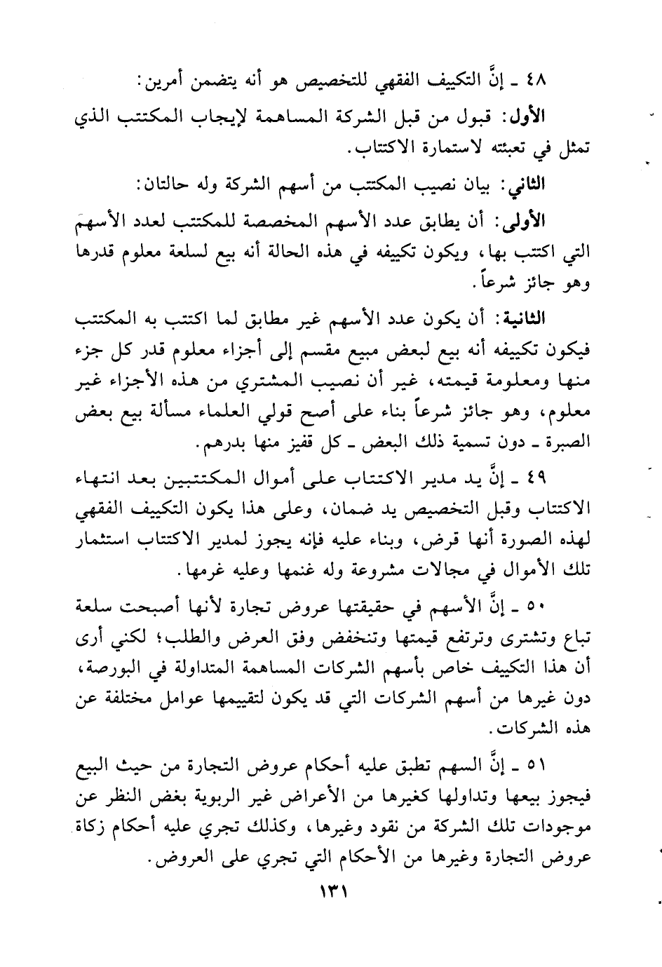 50 - إن الأسهم في حقيقتها عروض تجارة لأنها أصبحت سلعة تباع وتشترى وترتفع قيمتها وتنخفض وفق العرض والطلب، لكني أرى أن هذا التكييف خاص بأسهم الشركات المساهمة المتداولة في البورصة، دون غيرها من أسهم الشركات التي قد يكون لتقييمها عوامل مختلفة عن هذه الشركات.