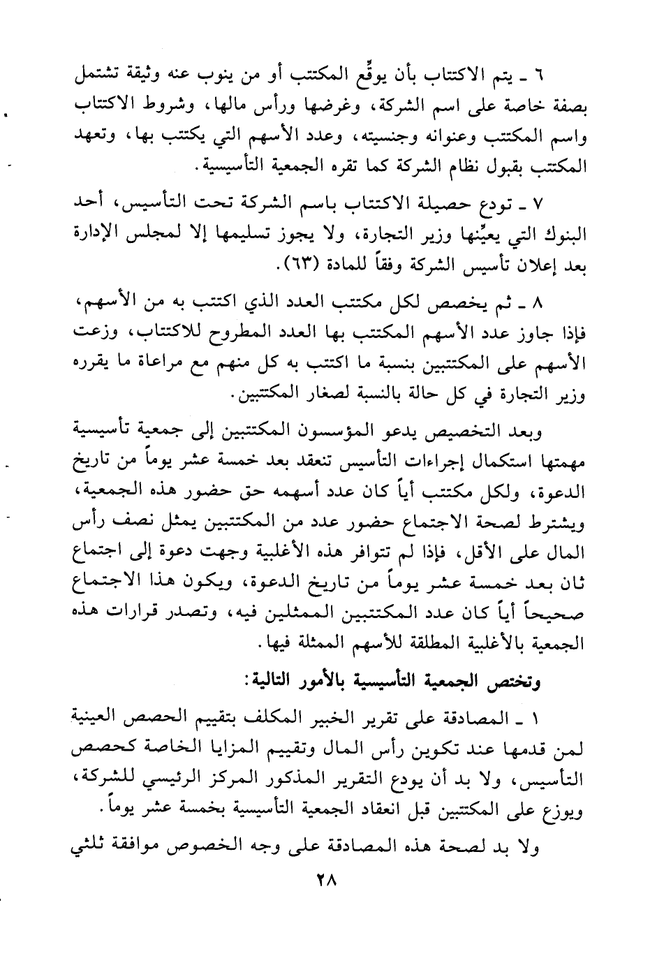 6 - يتم الاكتتاب بأن يوقع المكتتب أو من ينوب عنه وثيقة تشتمل بصفة خاصة على اسم الشركة، وغرضها ورأس مالها، وشروط الاكتتاب واسم المكتتب وعنوانه وجنسيته، وعدد الأسهم التي يكتتب بها، وتعهد المكتتب بقبول نظام الشركة كما تقره الجمعية التأسيسية.