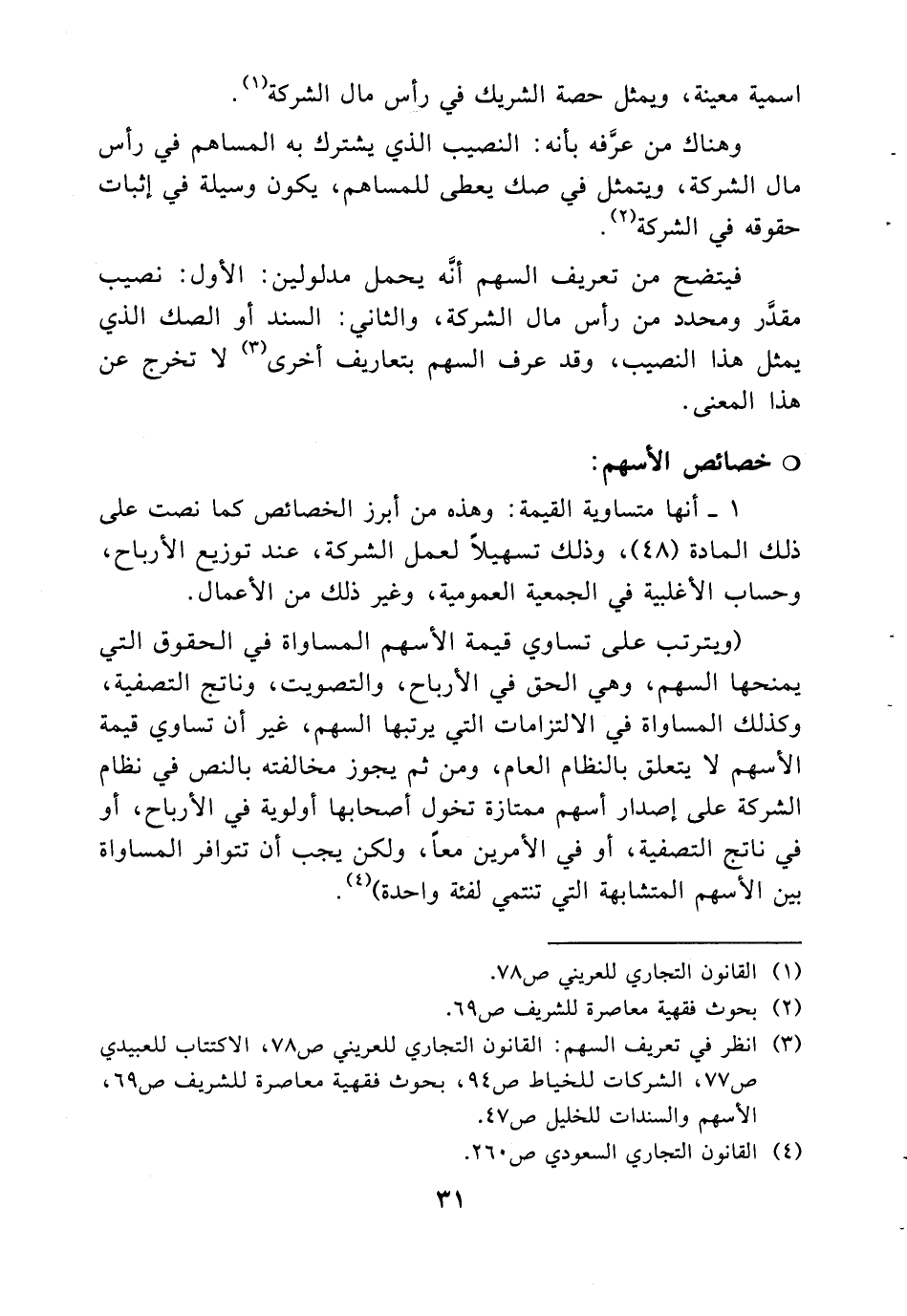 (¬3) انظر في تعريف السهم: القانون التجاري للعريني ص78، الاكتتاب للعبيدي ص77، الشركات للخياط ص94، بحوث فقهية معاصرة للشريف ص69، الأسهم والسندات للخليل ص47.