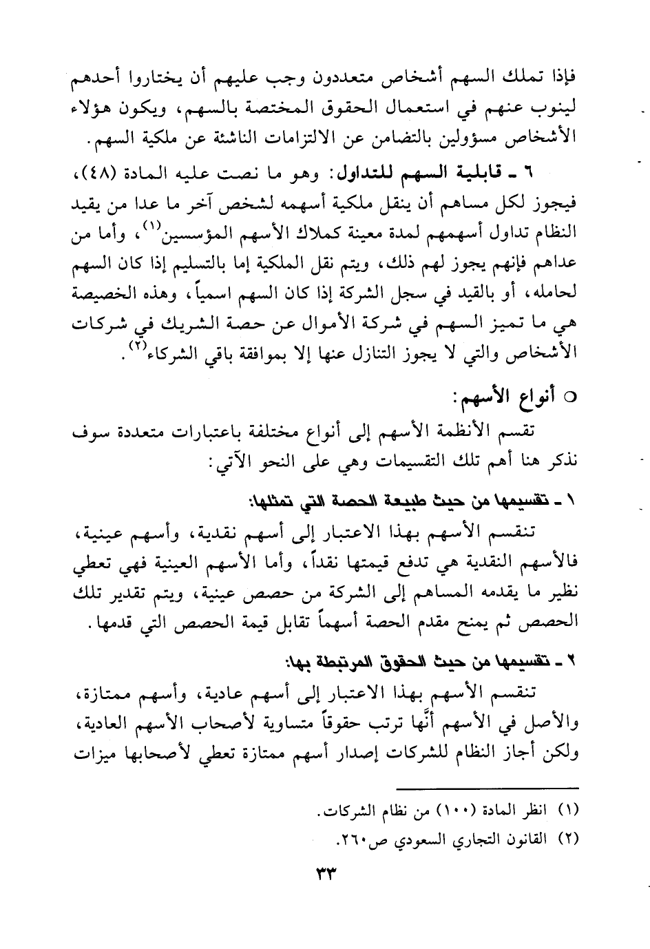 6 - قابلية السهم للتداول: وهو ما نصت عليه المادة (48)، فيجوز لكل مساهم أن ينقل ملكية أسهمه لشخص آخر ماعدا من يقيد النظام تداول أسهمهم لمدة معينة كملاك الأسهم المؤسسين (¬1)، وأما من عداهم فإنهم يجوز لهم ذلك، ويتم نقل الملكية إما بالتسليم إذا كان السهم لحامله، أو بالقيد في سجل الشركة إذا كان السهم اسميا، وهذه الخصيصة هي ما تميز السهم في شركة الأموال عن حصة الشريك في شركات الأشخاص والتي لا يجوز التنازل عنها إلا بموافقة باقي الشركاء (¬2).