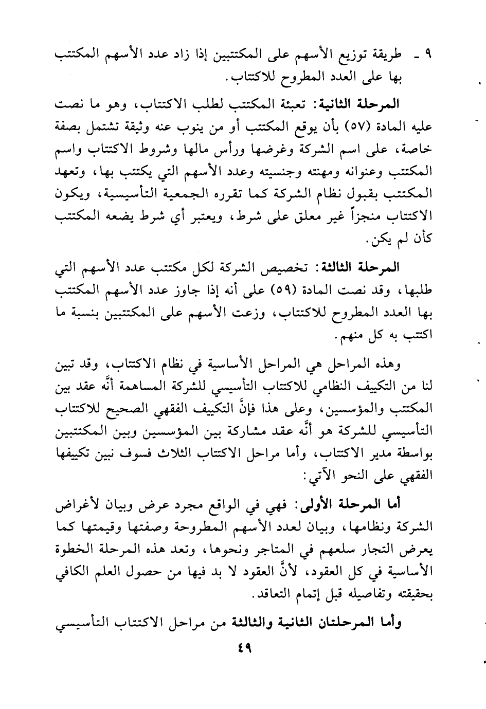 وهذه المراحل هي المراحل الأساسية في نظام الاكتتاب، وقد تبين لنا من التكييف النظامي للاكتتاب التأسيسي للشركة المساهمة أنه عقد بين المكتتب والمؤسسين، وعلى هذا فإن التكييف الفقهي الصحيح للاكتتاب التأسيسي للشركة هو أنه عقد مشاركة بين المؤسسين وبين المكتتبين بواسطة مدير الاكتتاب، وأما مراحل الاكتتاب الثلاث فسوف نبين تكييفها الفقهي على النحو الآتي: