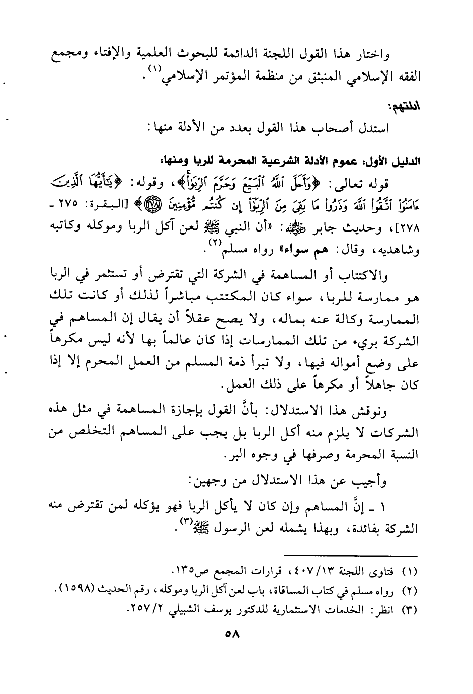 1 - إن المساهم وإن كان لا يأكل الربا فهو يؤكله لمن تقترض منه الشركة بفائدة، وبهذا يشمله لعن الرسول - صلى الله عليه وسلم - (¬3).