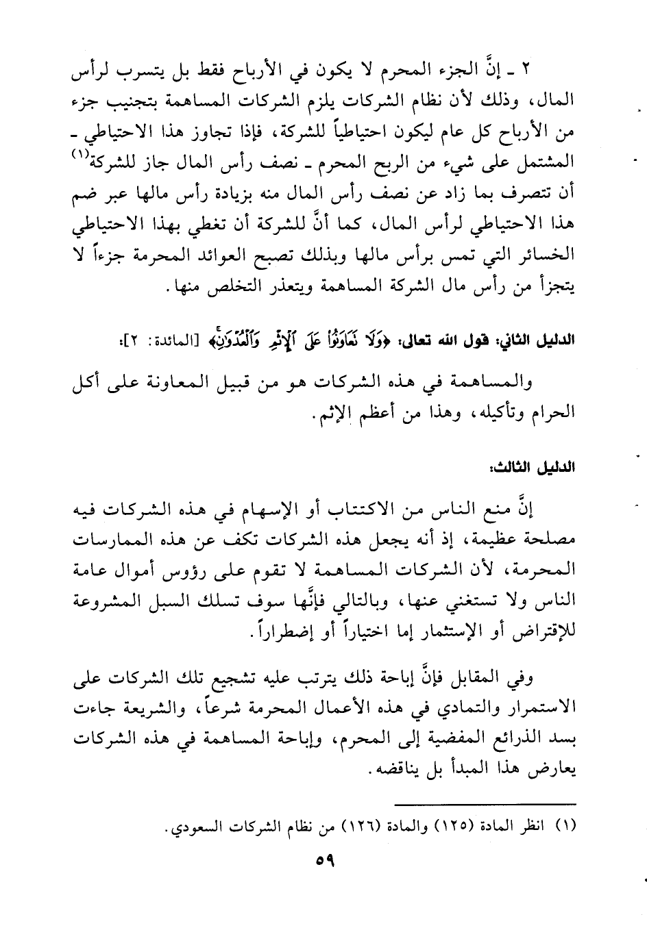 2 - إن الجزء المحرم لا يكون في الأرباح فقط بل يتسرب لرأس المال، وذلك لأن نظام الشركات يلزم الشركات المساهمة بتجنيب جزء من الأرباح كل عام ليكون احتياطيا للشركة، فإذا تجاوز هذا الاحتياطي ـ المشتمل على شيء من الربح المحرم ـ نصف رأس المال جاز للشركة (¬1) أن تتصرف بما زاد عن نصف رأس المال منه بزيادة رأس مالها عبر ضم هذا الاحتياطي لرأس المال، كما أن للشركة أن تغطي بهذا الاحتياطي الخسائر التي تمس برأس مالها وبذلك تصبح العوائد المحرمة جزءاً لا يتجزأ من رأس مال الشركة المساهمة ويتعذر التخلص منها.