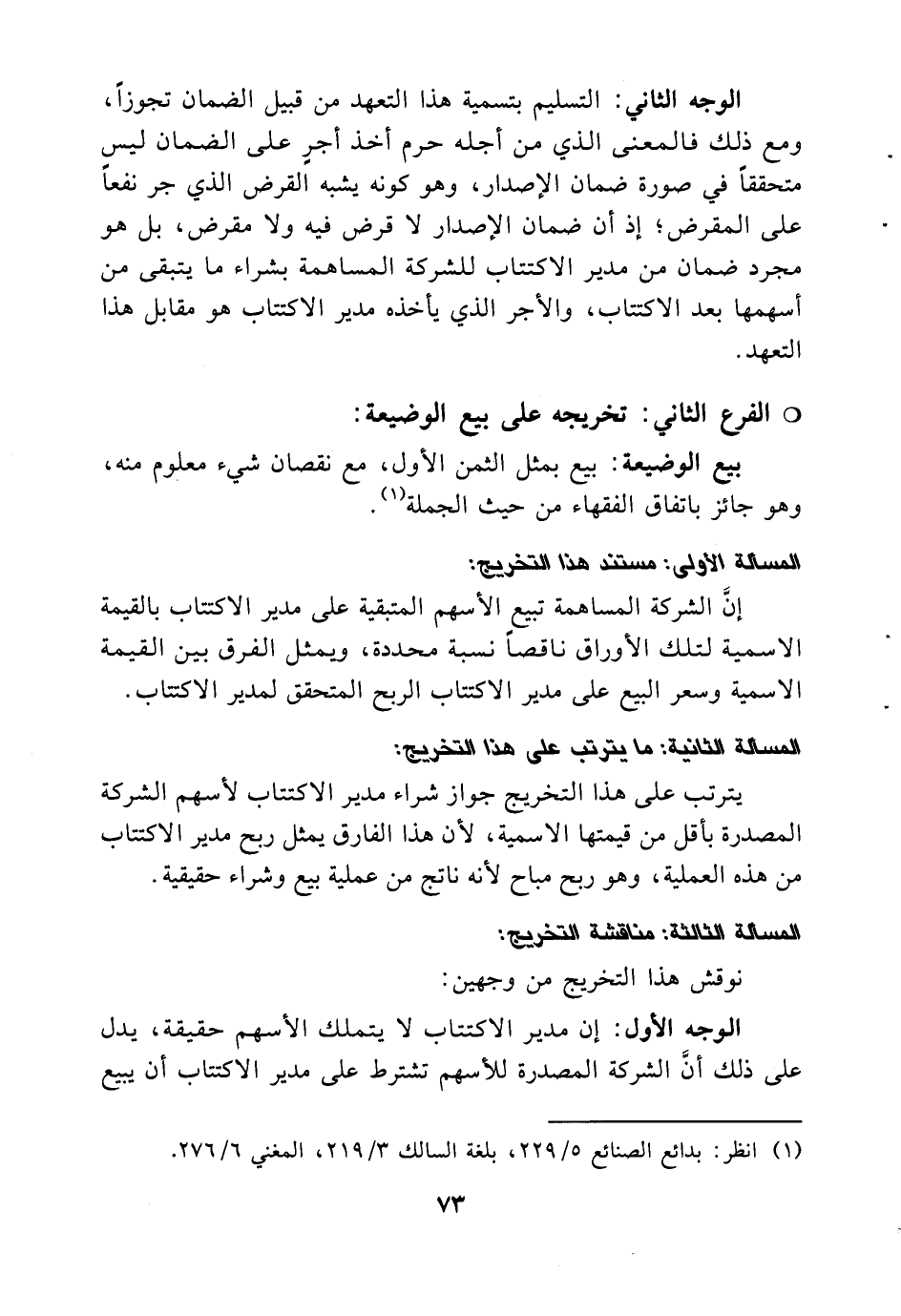 الوجه الثاني: التسليم بتسمية هذا التعهد من قبيل الضمان تجوزا، ومع ذلك فالمعنى الذي من أجله حرم أخذ أجر على الضمان ليس متحققا في صورة ضمان الإصدار، وهو كونه يشبه القرض الذي جر نفعا على المقرض، إذ أن ضمان الإصدار لا قرض فيه ولا مقرض، بل هو مجرد ضمان من مدير الاكتتاب للشركة المساهمة بشراء ما يتبقى من أسهمها بعد الاكتتاب، والأجر الذي يأخذه مدير الاكتتاب هو مقابل هذا التعهد.