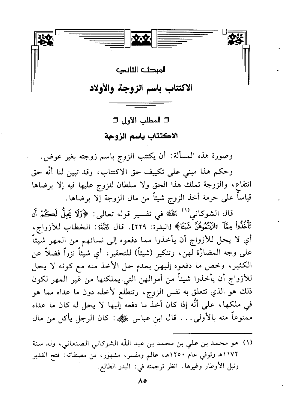 (¬1) هو محمد بن علي بن محمد بن عبد الله الشوكاني الصنعاني، ولد سنة 1172هـ وتوفي عام 1250هـ، عالم ومفسر، مشهور، من مصنفاته: فتح القدير ونيل الأوطار وغيرها. انظر ترجمته في: البدر الطالع.