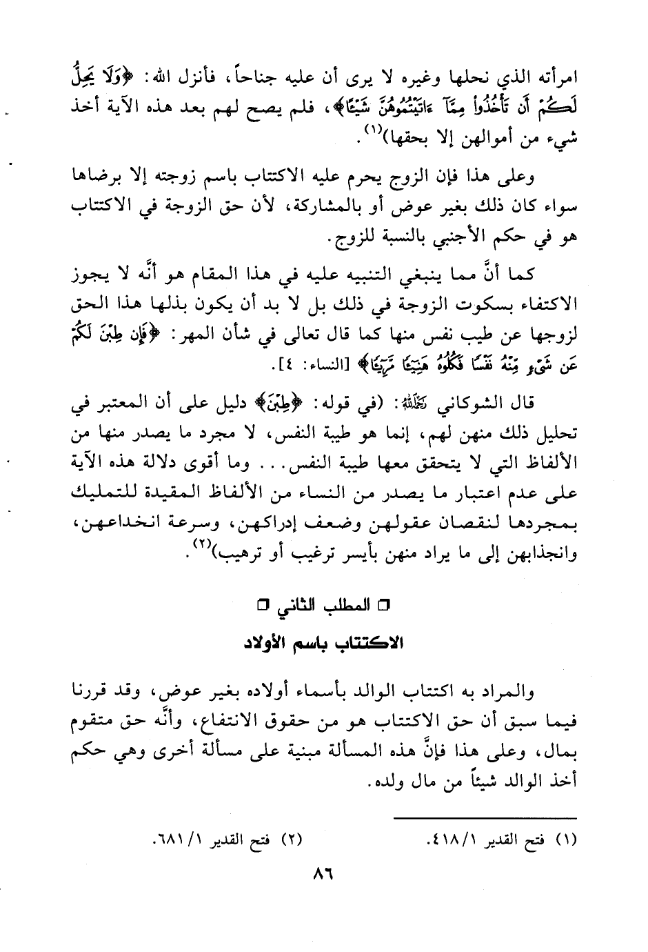 قال الشوكاني رحمه الله: (في قوله: {طِبْنَ} دليل على أن المعتبر في تحليل ذلك منهن لهم، إنما هو طيبة النفس، لا مجرد ما يصدر منها من الألفاظ التي لا يتحقق معها طيبة النفس ... وما أقوى دلالة هذه آية على عدم اعتبار ما يصدر من النساء من الألفاظ المقيدة للتمليك بمجردها لنقصان عقولهن وضعف إدراكهن، وسرعة انخداعهن، وانجذابهن إلى ما يراد منهن بأيسر ترغيب أو ترهيب) (¬2).
