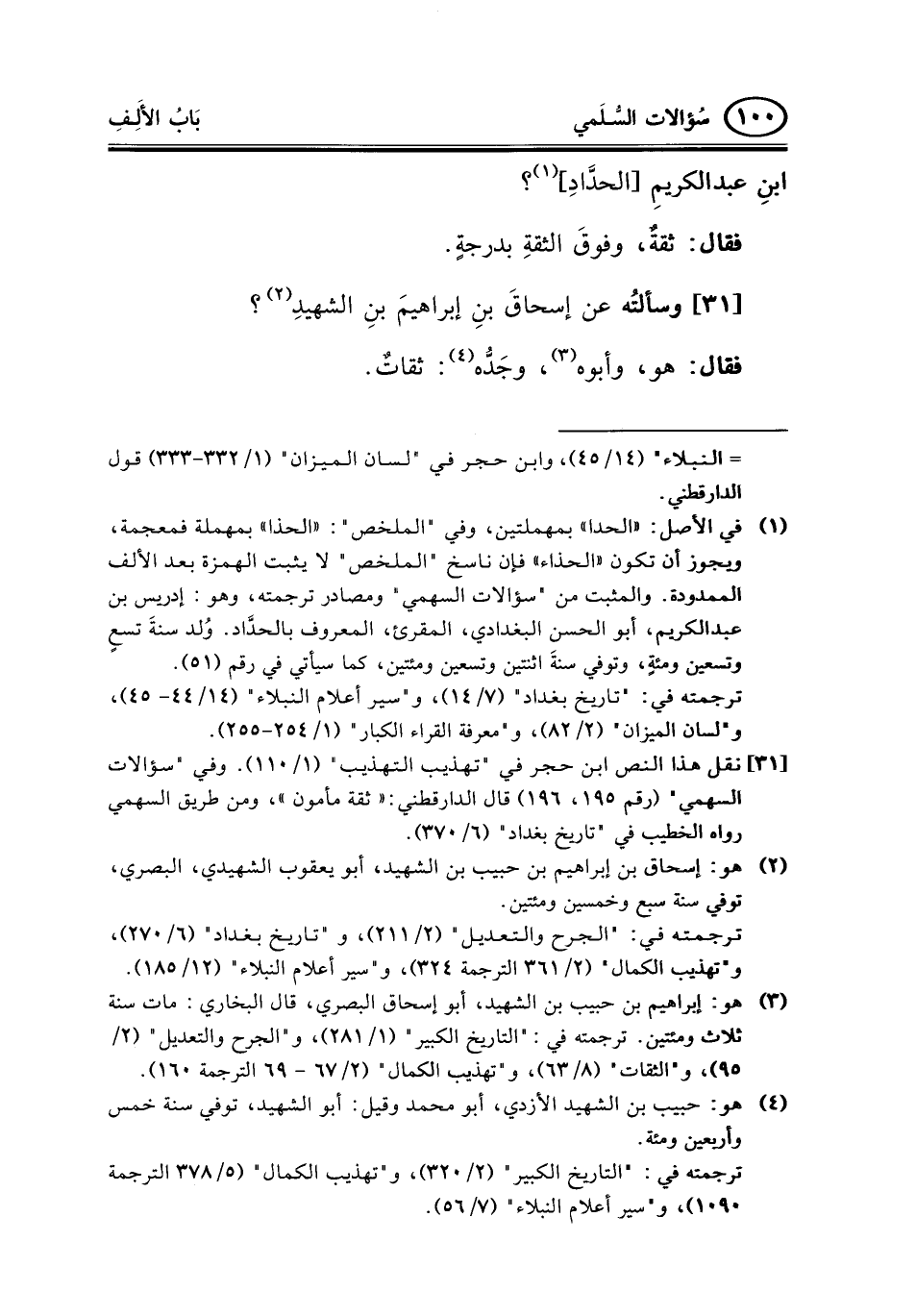 [31] نقل هذا النص ابن حجر في "تهذيب التهذيب" (1/110) . وفي "سؤالات السهمي" (رقم 195، 196) قال الدارقطني: «ثقة مأمون» ، ومن طريق السهمي رواه الخطيب في "تاريخ بغداد" (6/370) .