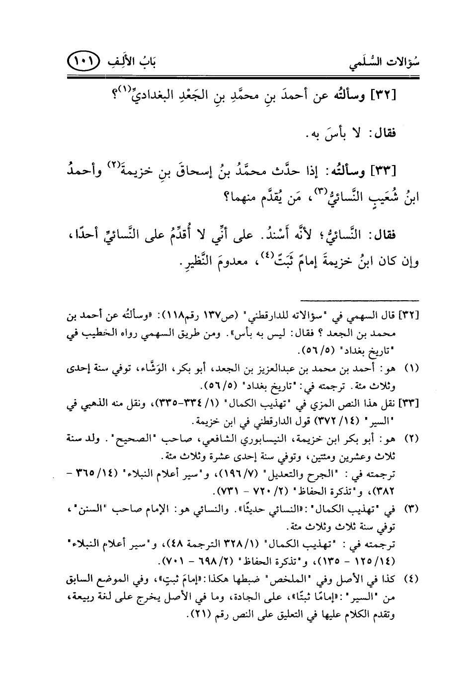 [33] نقل هذا النص المزي في "تهذيب الكمال" (1/334-335) ، ونقل منه الذهبي في "السير" (14/372) قول الدارقطني في ابن خزيمة.