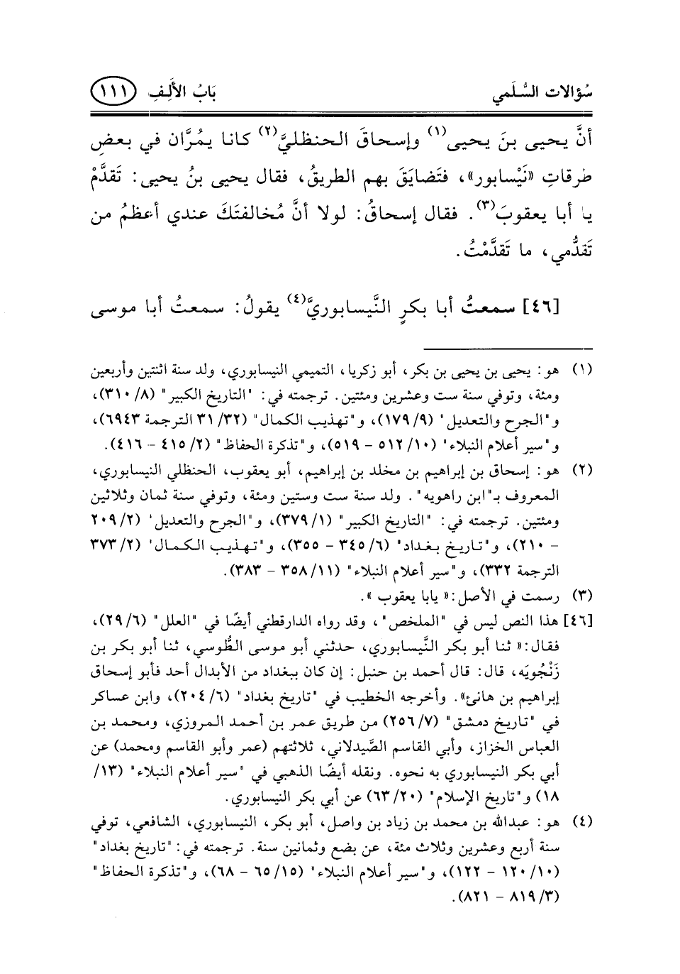 46 - سمعتُ أبا بكرٍ النَّيسابوريَّ (¬4) يقولُ: سمعتُ أبا موسى