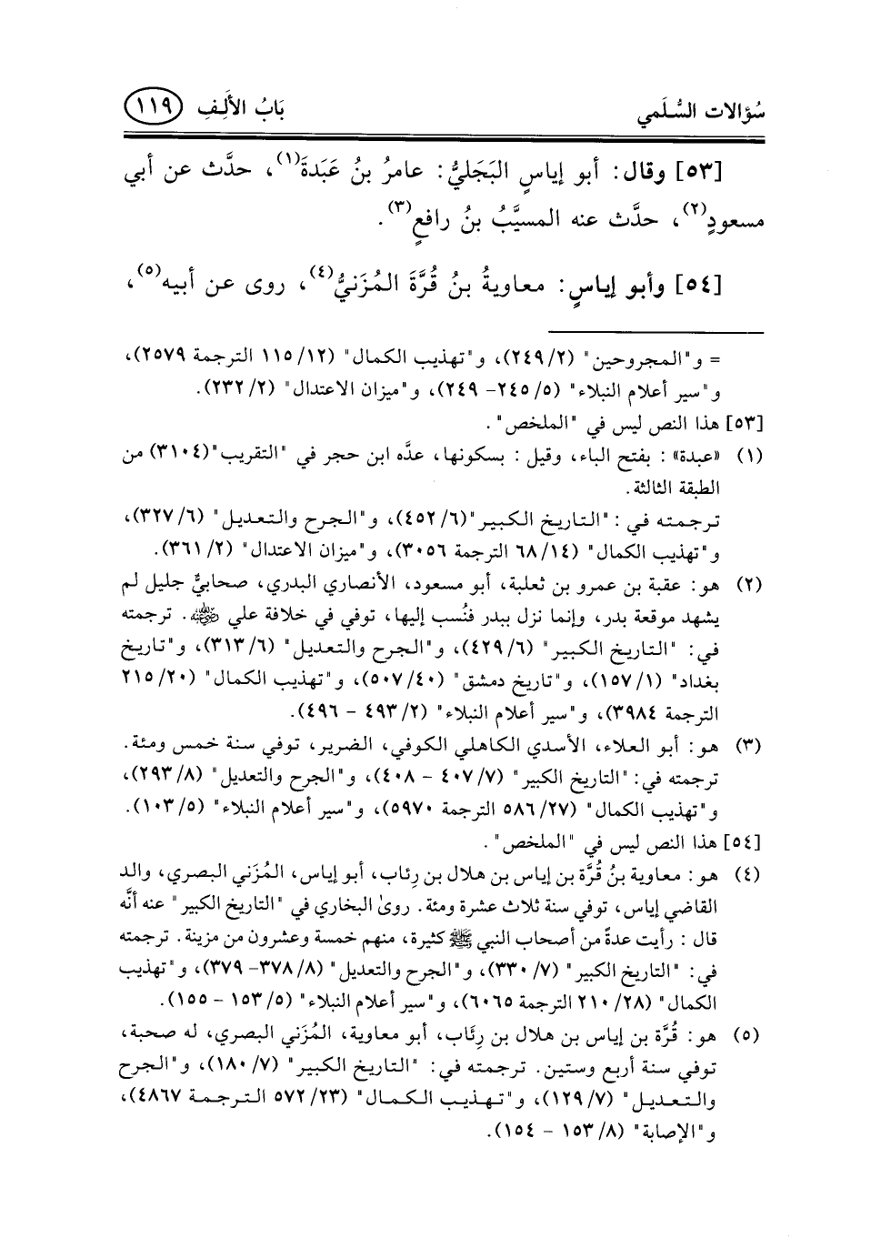 (¬4) هو: معاوية بنُ قُرَّة بن إياس بن هلال بن رِئاب، أبو إياس، المُزَني البصري، والد القاضي إياس، توفي سنة ثلاث عشرة ومئة. روى البخاري في "التاريخ الكبير" عنه أنَّه قال: رأيت عدةً من أصحاب النبي صلى الله عليه وسلم كثيرة، منهم خمسة وعشرون من مزينة. ترجمته في: "التاريخ الكبير" (7/330) ، و"الجرح والتعديل" (8/378- 379) ، و"تهذيب الكمال" (28/210 الترجمة 6065) ، و"سير أعلام النبلاء" (5/153- 155) .