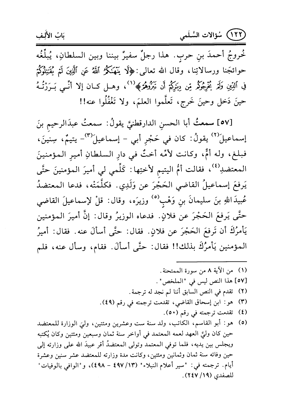 57 - سمعتُ أبا الحسنِ الدارقطنيَّ يقولُ: سمعتُ عبدَالرحيمِ بنَ إسماعيلَ (¬2) يقولُ: كان في حَجْرِ أبي- إسماعيلَ (¬3) - يتيمٌ، سِنينَ، فبلغ، وله أمٌّ، وكانت لأمِّه أختٌ في دارِ السلطانِ أميرِ المؤمنينَ المعتضدِ (¬4) ، فقالت أمُّ اليتيمِ لأختِها: كَلِّمي لي أميرَ المؤمنينَ حتَّى يَرفعَ إسماعيلُ القاضي الحَجْرَ عن وَلَدِي. فكلَّمَتْه، فدعا المعتضدُ عُبيدَ اللهِ بنَ سليمانَ بنِ وَهْبٍ (¬5) وزيرَه، وقال: قلْ لإسماعيلَ القاضي حتَّى يَرفعَ الحَجْرَ عن فلانٍ. فدعاه الوزيرُ وقال: إنَّ أميرَ المؤمنين يَأمرُكَ أن تَرفعَ الحَجْرَ عن فلانٍ. فقال: حتَّى أسألَ عنه. فقال: أميرُ المؤمنين يَأمرُكَ بذلك!! فقال: حتَّى أسألَ. فقام، وسأل عنه، فلم