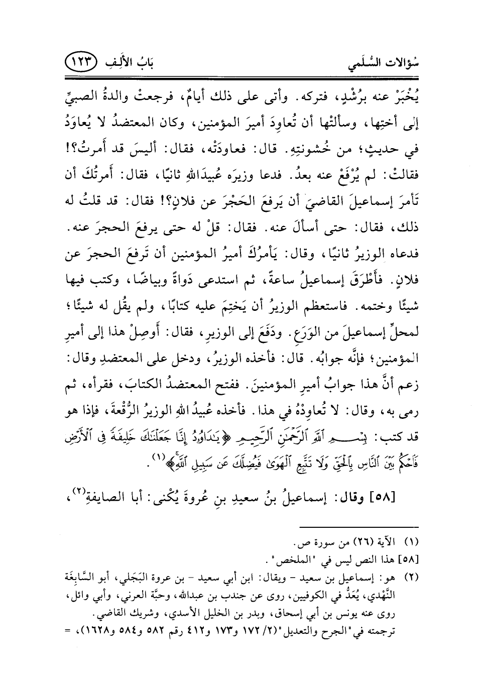 يُخْبَرْ عنه برُشْدٍ، فتركه. وأتى على ذلك أيامٌ، فرجعتْ والدةُ الصبيِّ إلى أختِها، وسألتْها أن تُعاوِدَ أميرَ المؤمنين، وكان المعتضدُ لا يُعاوَدُ في حديثٍ؛ من خُشونتِهِ. قال: فعاودَتْه، فقال: أليسَ قد أَمرتُ؟! فقالتْ: لم يُرْفَعْ عنه بعدُ. فدعا وزيرَه عُبيدَاللهِ ثانيًا، فقال: أَمرتُكَ أن تَأمرَ إسماعيلَ القاضيَ أن يَرفعَ الحَجْرَ عن فلانٍ؟! فقال: قد قلتُ له ذلك، فقال: حتى أسألَ عنه. فقال: قلْ له حتى يرفعَ الحجرَ عنه. فدعاه الوزيرُ ثانيًا، وقال: يَأمرُكَ أميرُ المؤمنين أن تَرفعَ الحجرَ عن فلانٍ. فأَطْرَقَ إسماعيلُ ساعةً، ثم استدعى دَواةً وبياضًا، وكتب فيها شيئًا وختمه. فاستعظم الوزيرُ أن يَختِمَ عليه كتابًا، ولم يقُل له شيئًا؛ لمحلِّ إسماعيلَ من الوَرَعِ. ودَفَعَ إلى الوزيرِ، فقال: أَوصِلْ هذا إلى أميرِ المؤمنين؛ فإنَّه جوابُه. قال: فأخذه الوزيرُ، ودخل على المعتضدِ وقال: زعم أنَّ هذا جوابُ أميرِ المؤمنينَ. ففتح المعتضدُ الكتابَ، فقرأه، ثم رمى به، وقال: لا تُعاوِدْهُ في هذا. فأخذه عُبيدُ اللهِ الوزيرُ الرُّقْعةَ، فإذا هو قد كتب: {يَادَاوُودُ إِنَّا جَعَلْنَاكَ خَلِيفَةً فِي الأَرْضِ فَاحْكُمْ بَيْنَ النَّاسِ بِالْحَقِّ وَلاَ تَتَّبِعِ الْهَوَى فَيُضِلَّكَ عَنْ سَبِيلِ اللَّهِ} (¬1) .
