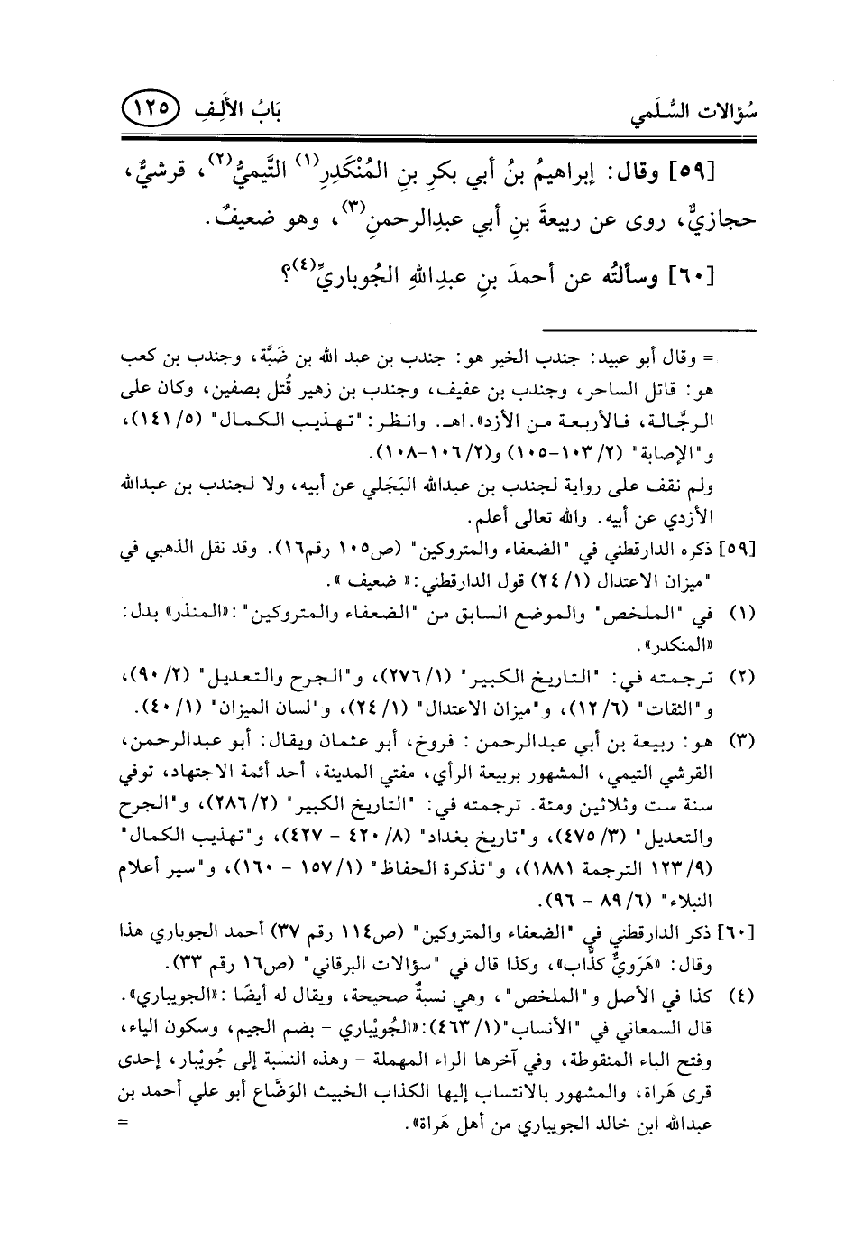 59 - وقال: إبراهيمُ بنُ أبي بكرِ بنِ المُنْكَدِرِ (¬1) التَّيميُّ (¬2) ، قرشيٌّ، حجازيٌّ، روى عن ربيعةَ بنِ أبي عبدِالرحمنِ (¬3) ، وهو ضعيفٌ.