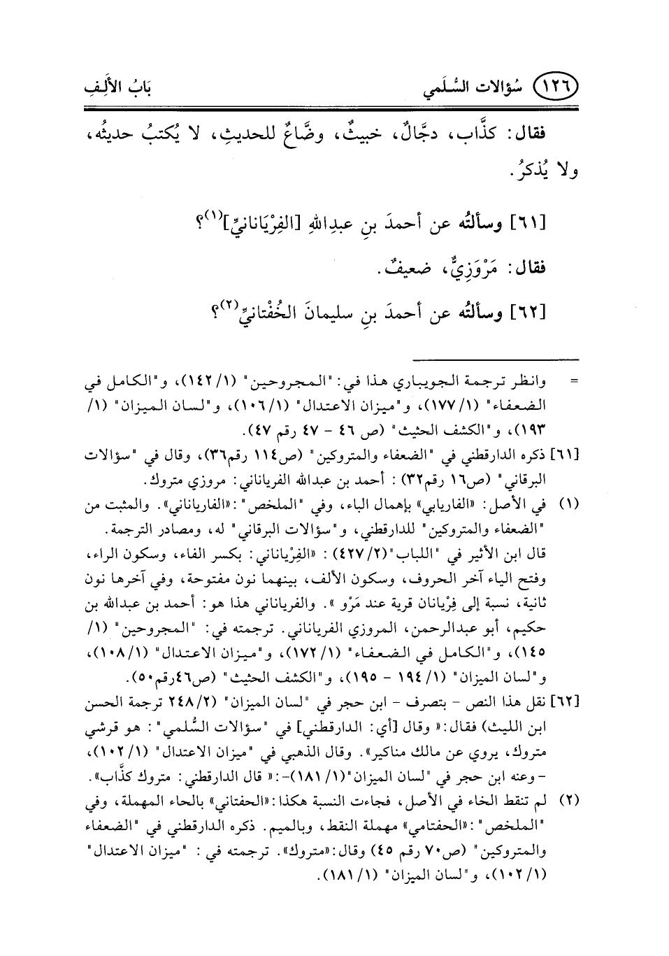 [61] ذكره الدارقطني في "الضعفاء والمتروكين" (ص114 رقم36) ، وقال في "سؤالات البرقاني" (ص16 رقم32) : أحمد بن عبد الله الفرياناني: مروزي متروك.