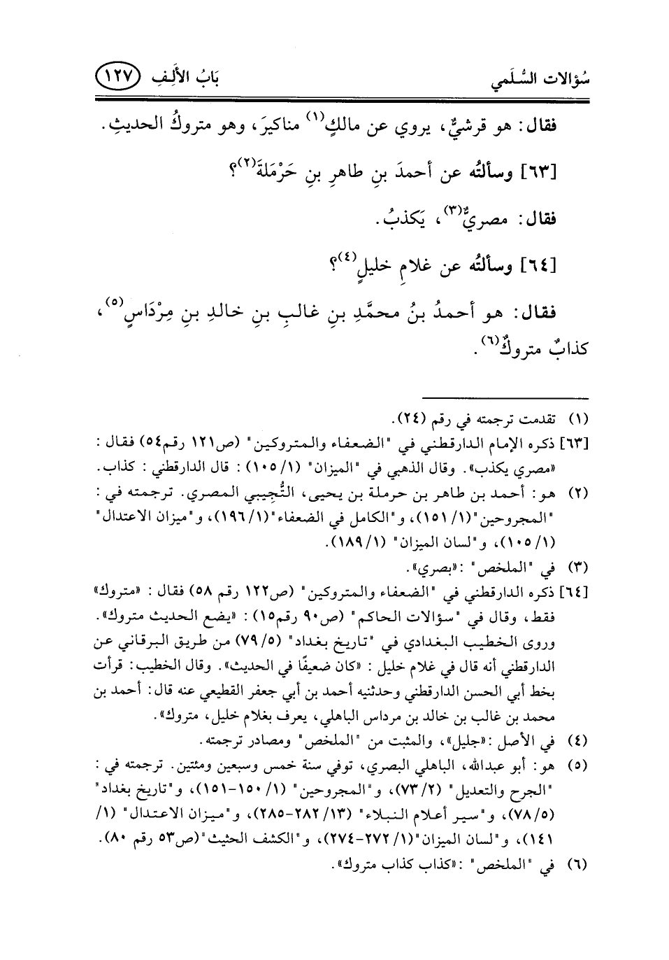 [64] ذكره الدارقطني في "الضعفاء والمتروكين" (ص122 رقم 58) فقال: «متروك» فقط، وقال في "سؤالات الحاكم" (ص90 رقم15) : «يضع الحديث متروك» . وروى الخطيب البغدادي في "تاريخ بغداد" (5/79) من طريق البرقاني عن الدارقطني أنه قال في غلام خليل: «كان ضعيفًا في الحديث» . وقال الخطيب: قرأت بخط أبي الحسن الدارقطني وحدثنيه أحمد بن أبي جعفر القطيعي عنه قال: أحمد بن محمد بن غالب بن خالد بن مرداس الباهلي، يعرف بغلام خليل، متروك» .