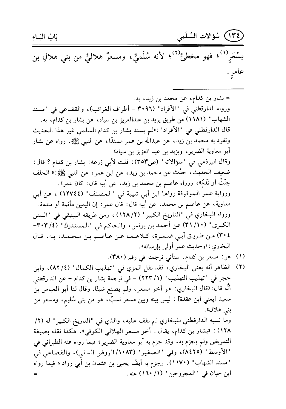 (¬2) الظاهر أنه يعني البخاري، فقد نقل المزي في "تهذيب الكمال" (4/82) ، وابن حجر في "تهذيب التهذيب" (1/223) - في ترجمة بشار بن كدام- عن الدارقطني أنَّه قال: «قال البخاري: هو أخو مسعر، ولم يصنع شيئًا. وقال لنا أبو العباس بن سعيد [يعني ابن عقدة] : ليس بينه وبين مسعر نسبٌ، هو من بني سُليمٍ، ومسعر من بني هلال» .