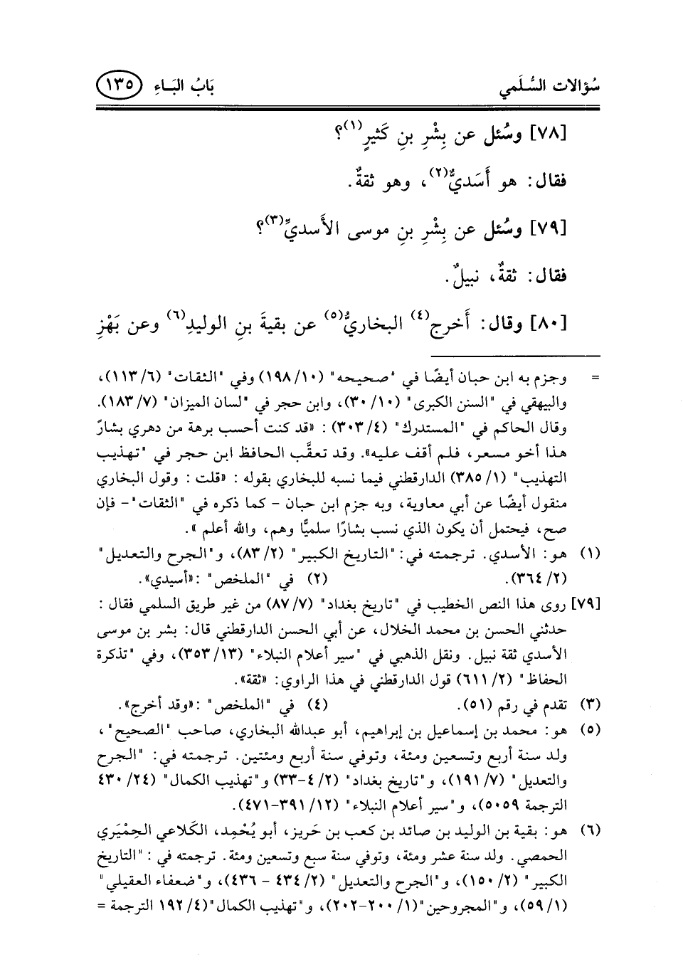 [79] روى هذا النص الخطيب في "تاريخ بغداد" (7/87) من غير طريق السلمي فقال: حدثني الحسن بن محمد الخلال، عن أبي الحسن الدارقطني قال: بشر بن موسى الأسدي ثقة نبيل. ونقل الذهبي في "سير أعلام النبلاء" (13/353) ، وفي "تذكرة الحفاظ" (2/611) قول الدارقطني في هذا الراوي: «ثقة» .