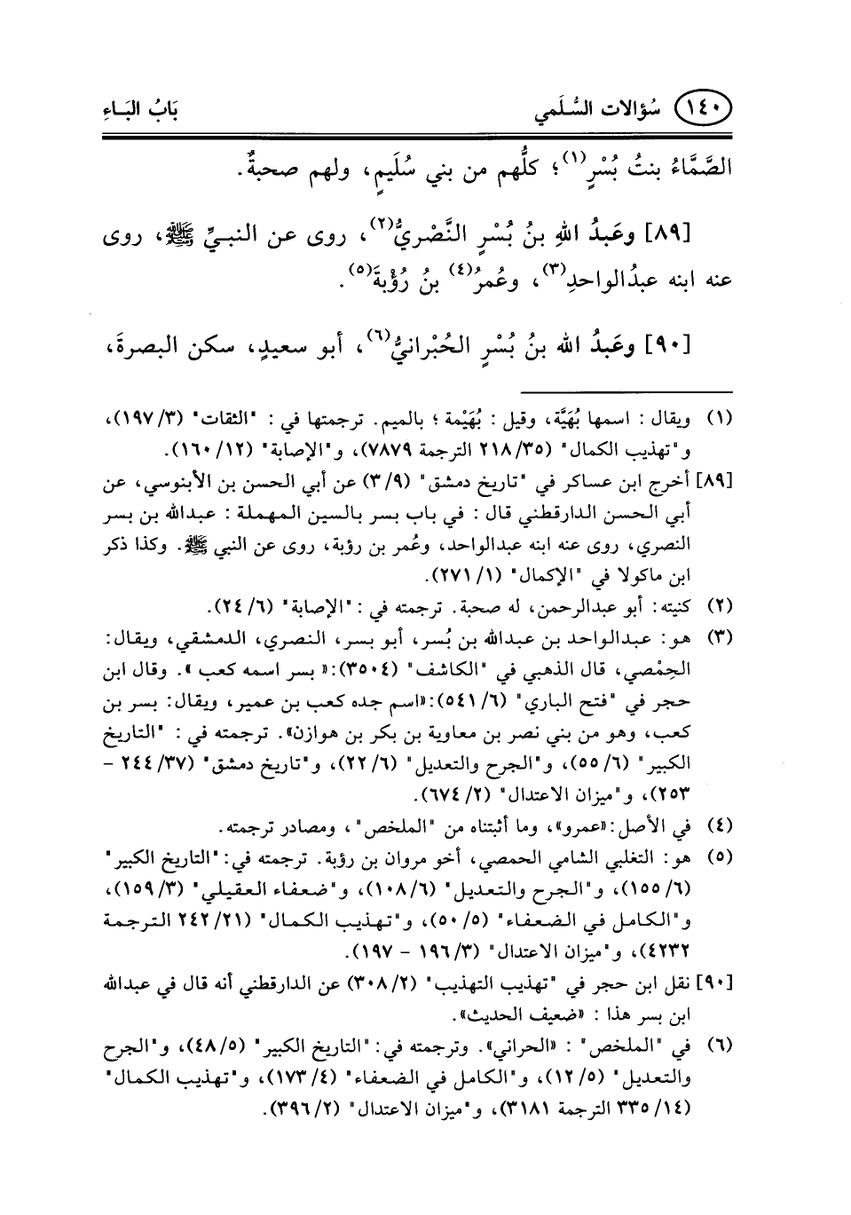 89 - وعَبدُ اللهِ بنُ بُسْرٍ النَّصْريُّ (¬2) ، روى عن النبيِّ صلى الله عليه وسلم، روى عنه ابنه عبدُالواحدِ (¬3) ، وعُمرُ (¬4) بنُ رُؤْبةَ (¬5) .