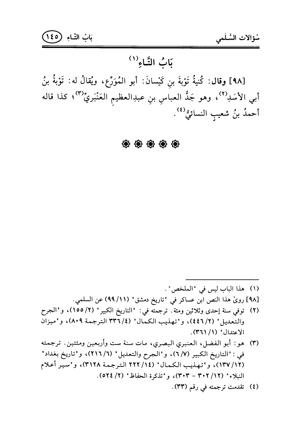 98 - وقال: كُنيةُ تَوْبةَ بنِ كَيْسانَ: أبو المُوَرِّع، ويُقالُ له: تَوْبةُ بنُ أبي الأسَدِ (¬2) ، وهو جَدُّ العباسِ بنِ عبدِالعظيمِ العَنْبَريِّ (¬3) ؛ كذا قاله أحمدُ بنُ شعيبٍ النسائيُّ (¬4) .