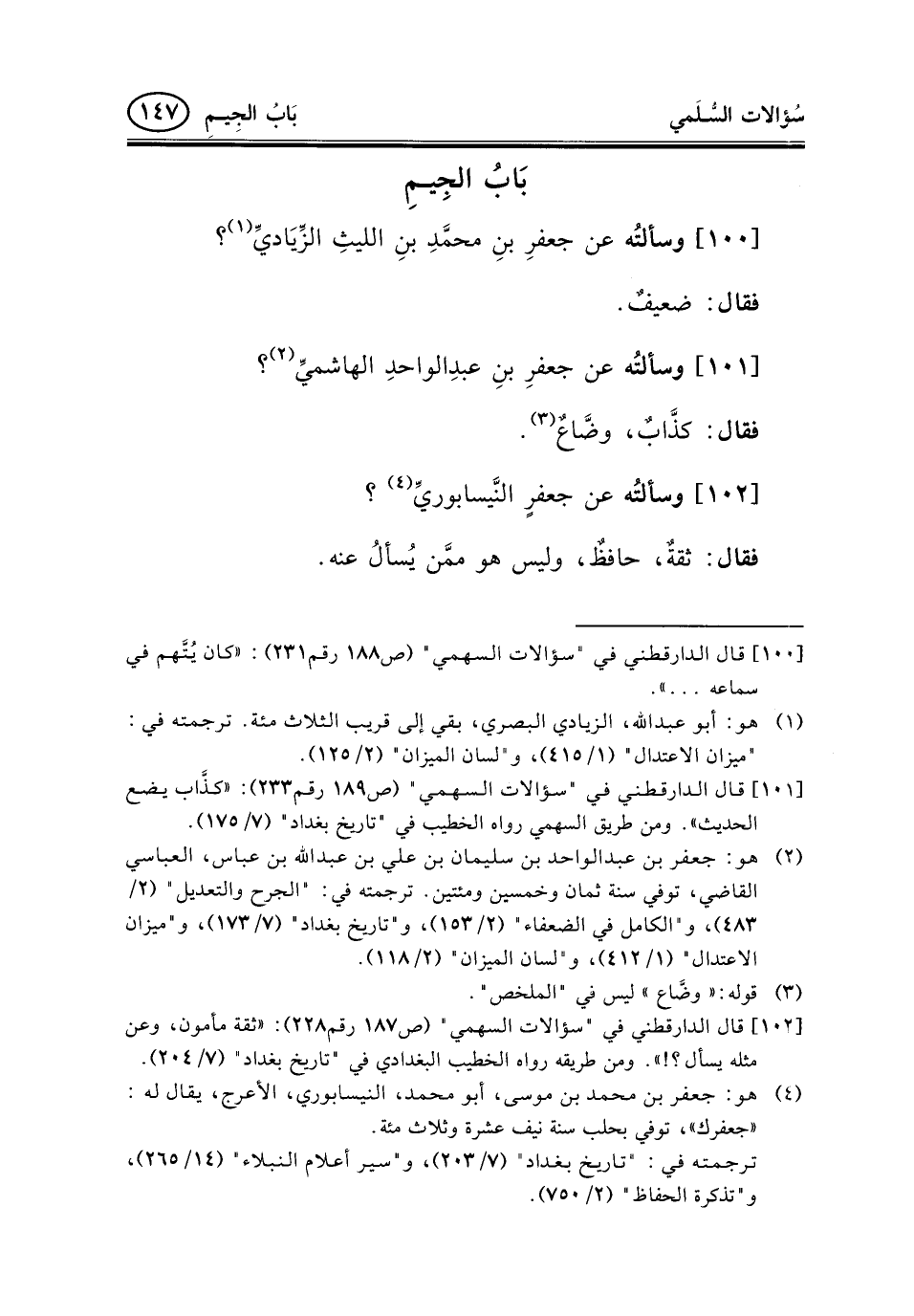 [102] قال الدارقطني في "سؤالات السهمي" (ص187 رقم228) : «ثقة مأمون، وعن مثله يسأل؟!» . ومن طريقه رواه الخطيب البغدادي في "تاريخ بغداد" (7/204) .