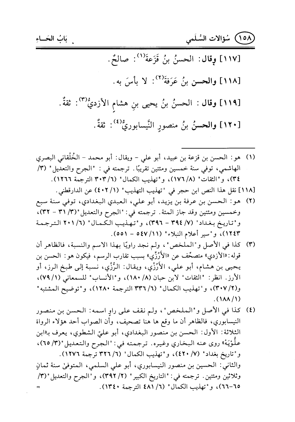 وهذا الإسناد هو إسناد ابن عساكر لـ"سؤالات السلمي" كما بيَّنَّاه في المقدمة (58) ، ولم نجد هذا النص في نسختي "السؤالات" التي بين أيدينا، فالله أعلم. وانظر ترجمة الحسين بن الوليد في "الجرح والتعديل" (3/66 رقم303) ، و"تاريخ بغداد" (8/143 رقم 4240) ، و"تاريخ دمشق" (14/342-348) ، و"تهذيب الكمال" (6/495) ، و"سير أعلام النبلاء" (9/520) .