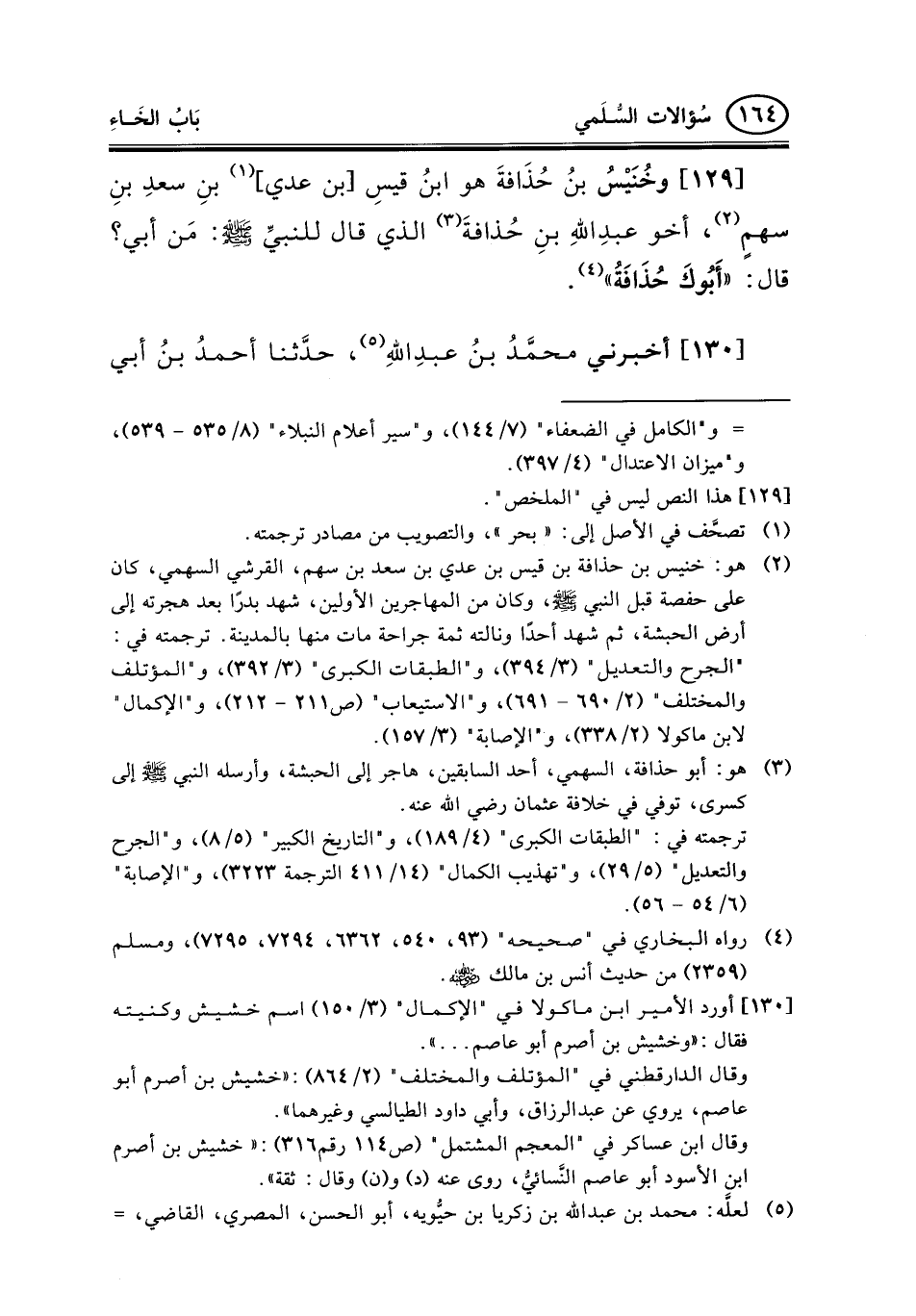129 - وخُنَيْسُ بنُ حُذَافةَ هو ابنُ قيسِ [بن عدي] (¬1) بنِ سعدِ بنِ سهمٍ (¬2) ، أخو عبدِاللهِ بنِ حُذافةَ (¬3) الذي قال للنبيِّ صلى الله عليه وسلم: مَن أبي؟ قال: «أَبُوكَ حُذَافَةُ» (¬4) .