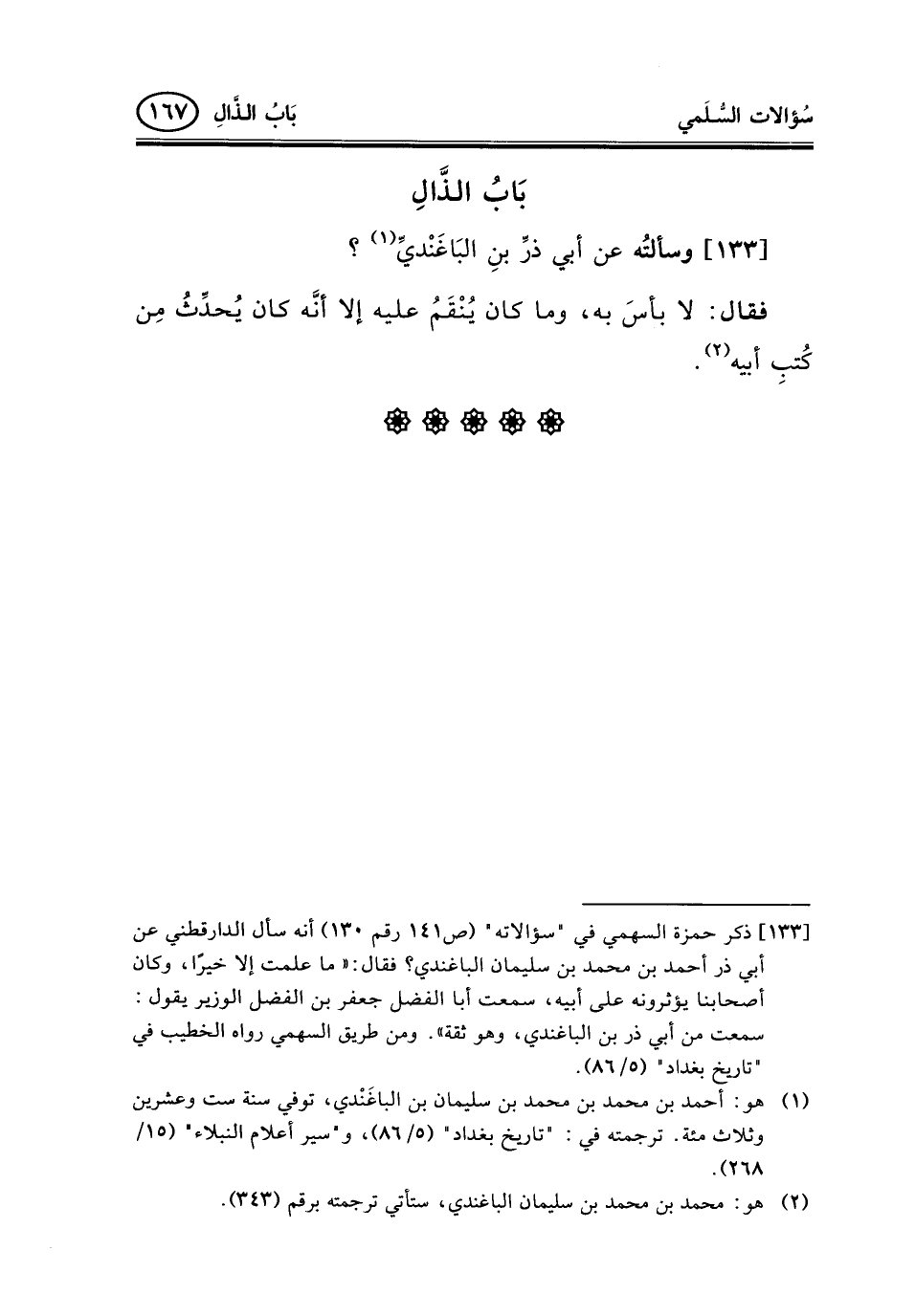 133 - وسألتُه عن أبي ذرِّ بنِ البَاغَنْديِّ (¬1) ؟