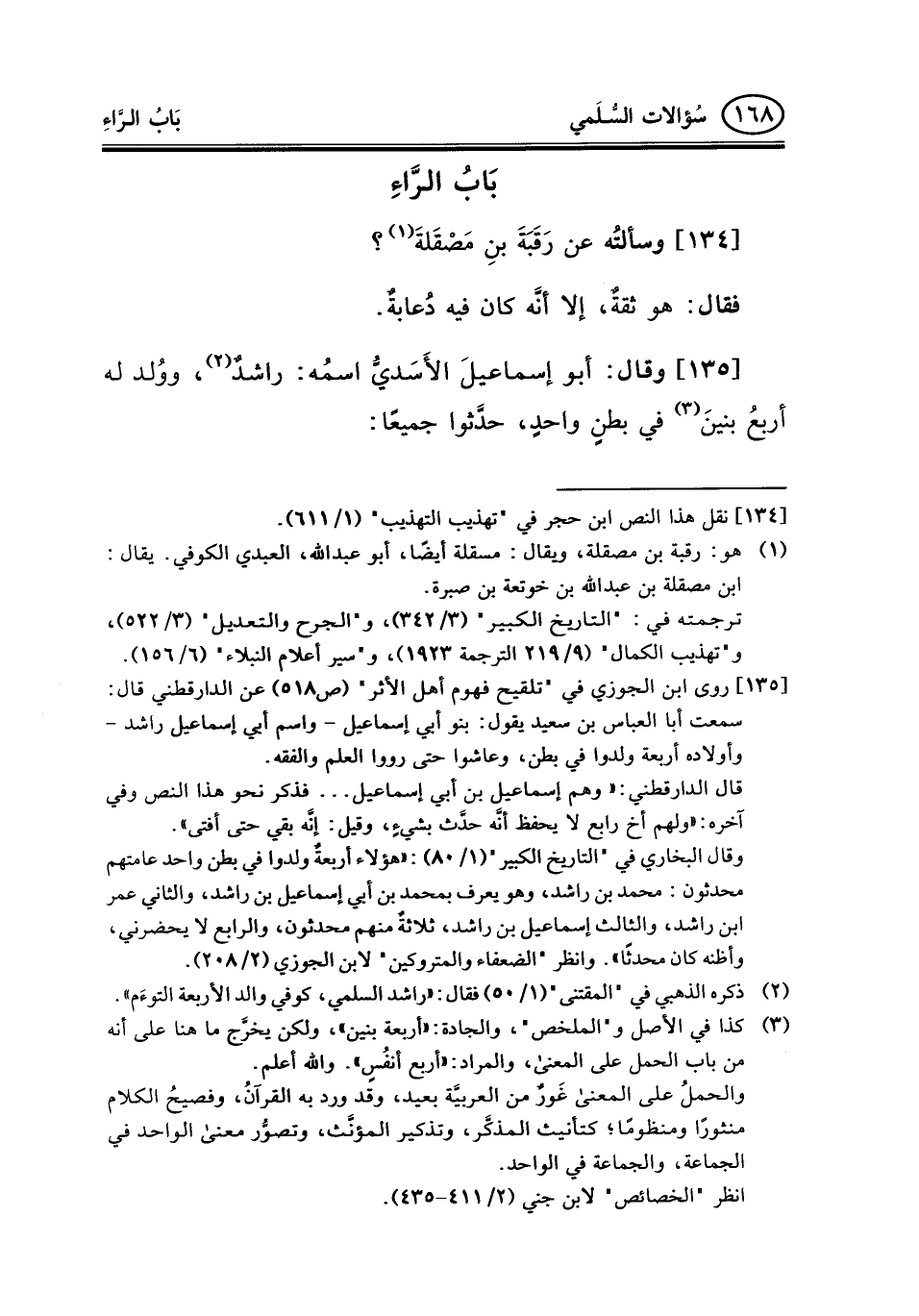 [135] روى ابن الجوزي في "تلقيح فهوم أهل الأثر" (ص518) عن الدارقطني قال: سمعت أبا العباس بن سعيد يقول: بنو أبي إسماعيل- واسم أبي إسماعيل راشد- وأولاده أربعة ولدوا في بطن، وعاشوا حتى رووا العلم والفقه.