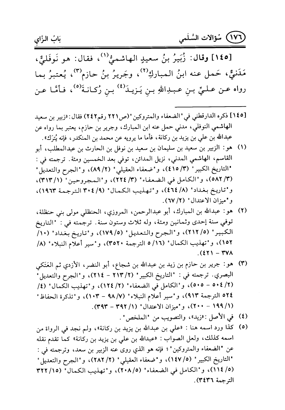 145 - وقال: زُبَيرُ بنُ سعيدٍ الهاشميُّ (¬1) ، فقال: هو نَوفَليٌّ، مَدَنيٌّ، حَمل عنه ابنُ المباركِ (¬2) ، وجَريرُ بنُ حازم (¬3) ، يُعتبرُ بما رواه عن عليِّ بنِ عبدِاللهِ بنِ يَزيدَ (¬4) بنِ رُكانةَ (¬5) ، فأمَّا عن