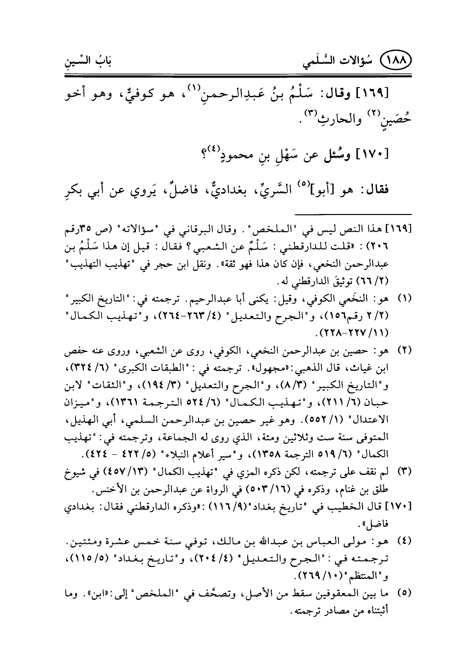 [169] هذا النص ليس في "الملخص". وقال البرقاني في "سؤالاته" (ص 35رقم 206) : «قلت للدارقطني: سَلْمٌ عن الشعبي؟ فقال: قيل إن هذا سَلْمُ بن عبد الرحمن النخعي، فإن كان هذا فهو ثقة» . ونقل ابن حجر في "تهذيب التهذيب" (2/66) توثيقَ الدارقطني له.