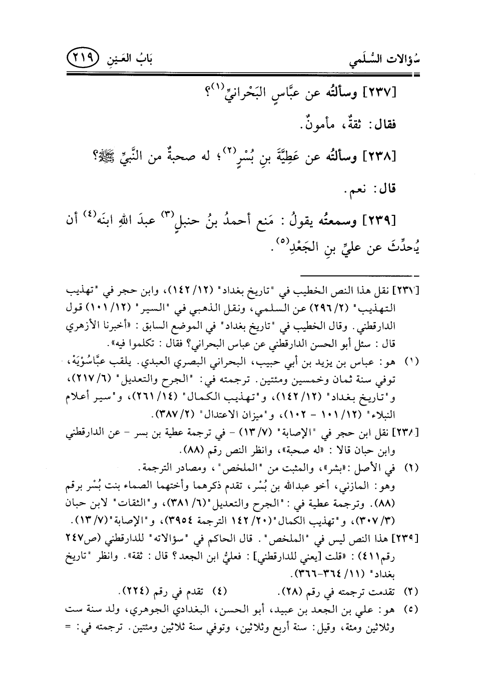 [237] نقل هذا النص الخطيب في "تاريخ بغداد" (12/142) ، وابن حجر في "تهذيب التهذيب" (2/296) عن السلمي، ونقل الذهبي في "السير" (12/101) قول الدارقطني. وقال الخطيب في "تاريخ بغداد" في الموضع السابق: «أخبرنا الأزهري قال: سئل أبو الحسن الدارقطني عن عباس البحراني؟ فقال: تكلموا فيه» .