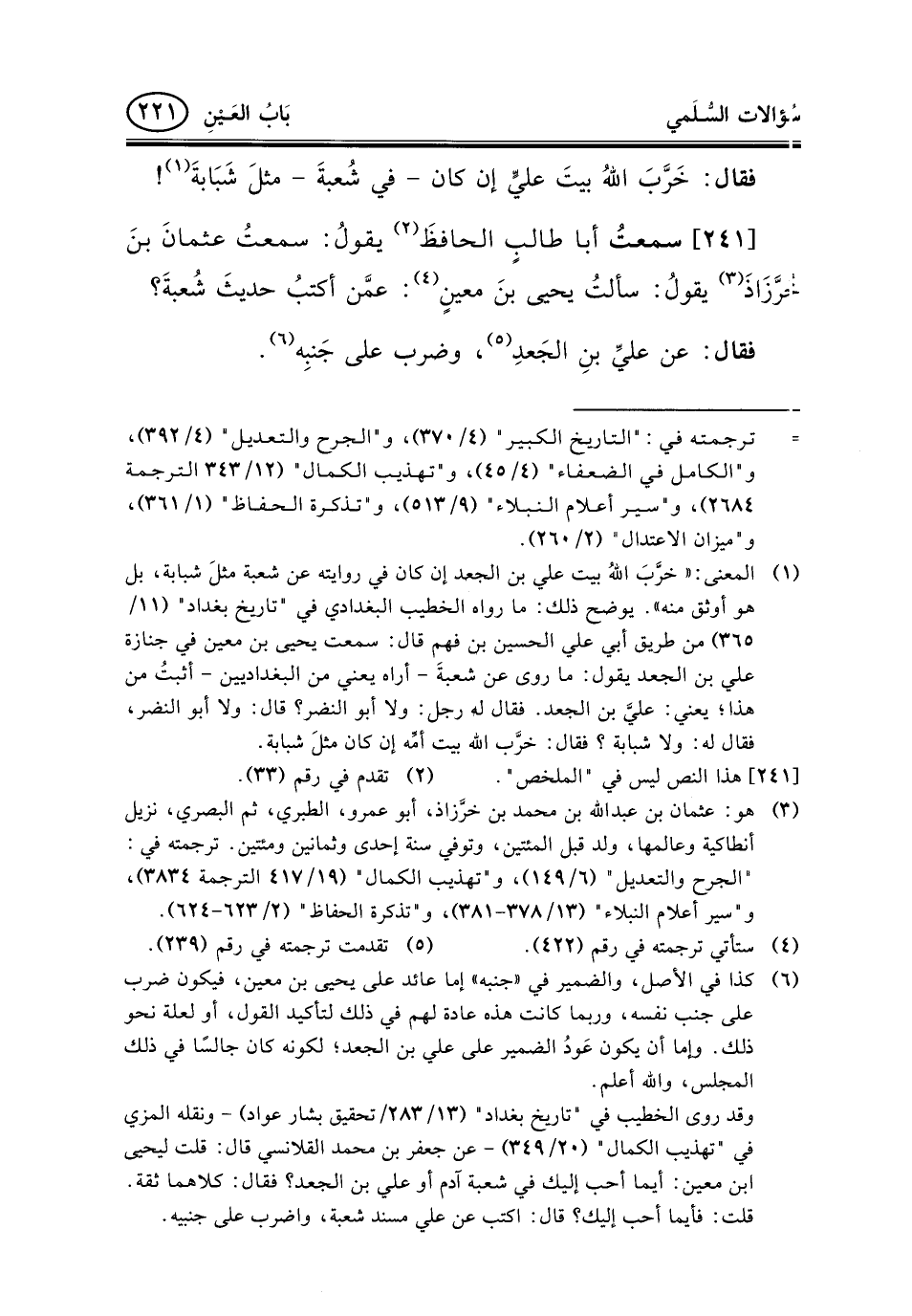 (¬1) المعنى: «خرَّبَ اللهُ بيت علي بن الجعد إن كان في روايته عن شعبة مثلَ شبابة، بل هو أوثق منه» . يوضح ذلك: ما رواه الخطيب البغدادي في "تاريخ بغداد" (11/365) من طريق أبي علي الحسين بن فهم قال: سمعت يحيى بن معين في جنازة علي بن الجعد يقول: ما روى عن شعبةَ- أراه يعني من البغداديين- أثبتُ من هذا؛ يعني: عليَّ بن الجعد. فقال له رجل: ولا أبو النضر؟ قال: ولا أبو النضر، فقال له: ولا شبابة؟ فقال: خرَّب الله بيت أمِّه إن كان مثلَ شبابة.