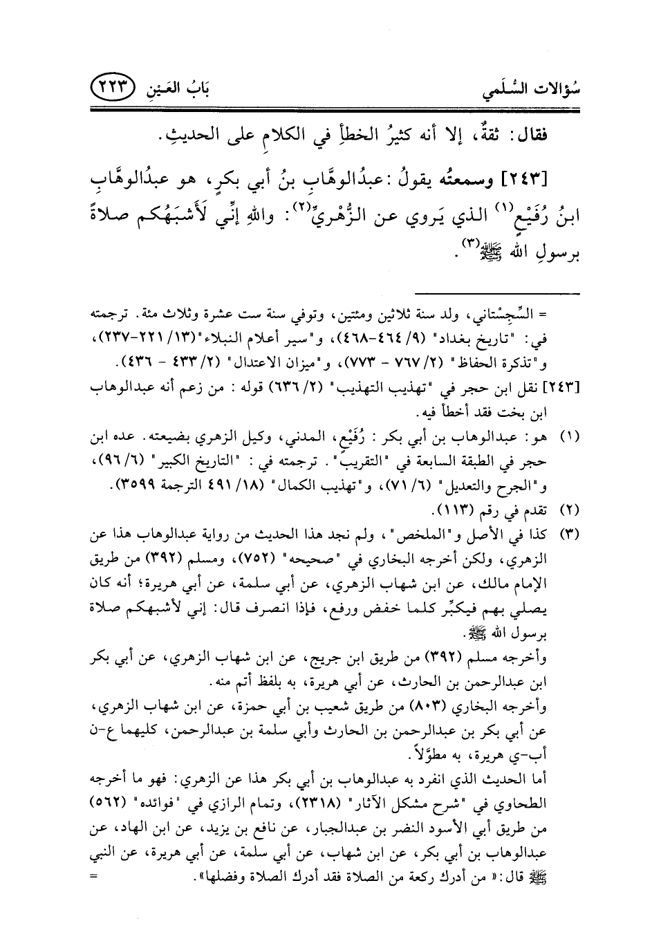 243 - وسمعتُه يقولُ: عبدُالوهَّابِ بنُ أبي بكرٍ، هو عبدُالوهَّابِ ابنُ رُفَيْعٍ (¬1) الذي يَروي عن الزُّهْريِّ (¬2) : واللهِ إنِّي لَأَشبَهُكم صلاةً برسولِ الله صلى الله عليه وسلم (¬3) .