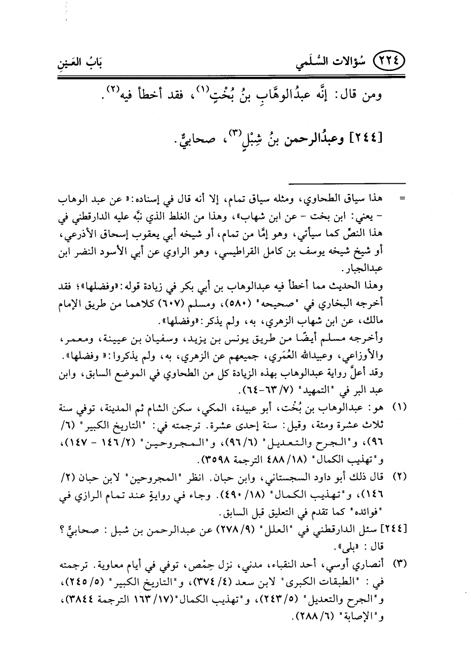 [244] سئل الدارقطني في "العلل" (9/278) عن عبد الرحمن بن شبل: صحابيٌّ؟ قال: «بلى» .