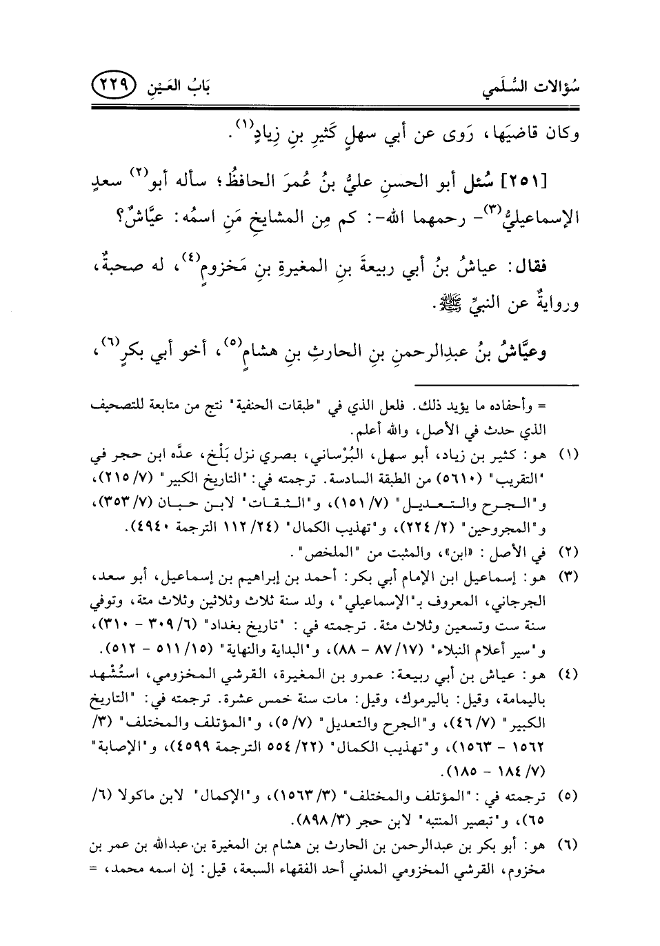 251 - سُئل أبو الحسنِ عليُّ بنُ عُمرَ الحافظُ؛ سأله أبو (¬2) سعدٍ الإسماعيليُّ (¬3) - رحمهما الله-: كم مِن المشايخِ مَنِ اسمُه: عيَّاشٌ؟