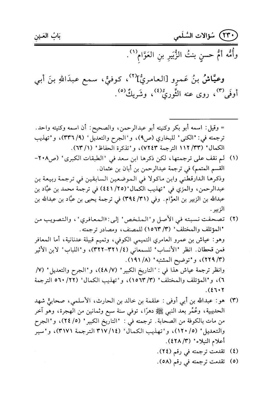 (¬3) هو: عبد الله بن أبي أوفى: علقمة بن خالد بن الحارث، الأسلمي، صحابيٌّ شهد الحديبية، وعُمِّر بعد النبي صلى الله عليه وسلم دهرًا، توفي سنة سبع وثمانين من الهجرة، وهو آخر من مات بالكوفة من الصحابة. ترجمته في: "التاريخ الكبير" (5/24) ، و"الجرح والتعديل" (5/120) ، و"تهذيب الكمال" (14/317 الترجمة 3171) ، و"سير أعلام النبلاء" (3/428) .