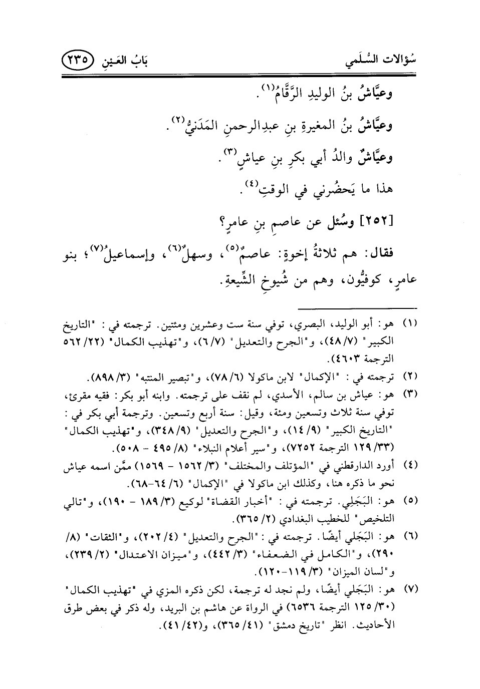 فقال: هم ثلاثةُ إخوةٍ: عاصمٌ (¬5) ، وسهلٌ (¬6) ، وإسماعيلُ (¬7) ؛ بنو عامرٍ، كوفيُّون، وهم من شُيوخِ الشِّيعةِ.