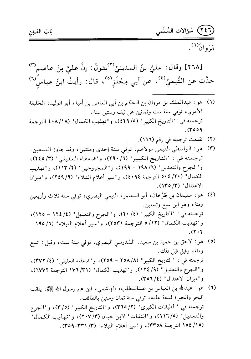 268 - وقال: عليُّ بنُ المدينيِّ (¬2) يقولُ: إنَّ عليَّ بنَ عاصمٍ (¬3) حدَّث عن التَّيميِّ (¬4) ، عن أبي مِجْلَزٍ (¬5) ، قال: رأيتُ ابنَ عباسٍ (¬6)