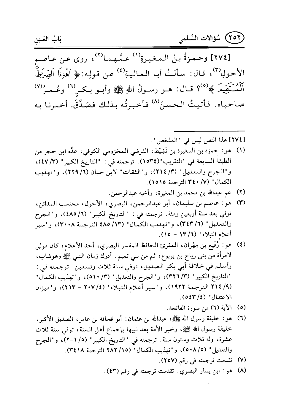 274 - وحمزةُ بنُ المغيرةِ (¬1) عمُّهما (¬2) ، روى عن عاصمٍ الأحولِ (¬3) ، قال: سألتُ أبا العاليةِ (¬4) عن قولِه: {اهْدِنَا الصِّرَاطَ المُسْتَقِيمَ} (¬5) ؟ قال: هو رسولُ اللهِ صلى الله عليه وسلم وأبو بكرٍ (¬6) وعُمرُ (¬7) صاحباه. فأتيتُ الحسنَ (¬8) فأخبرتُه بذلك فصَدَّقَ. أخبرنا به