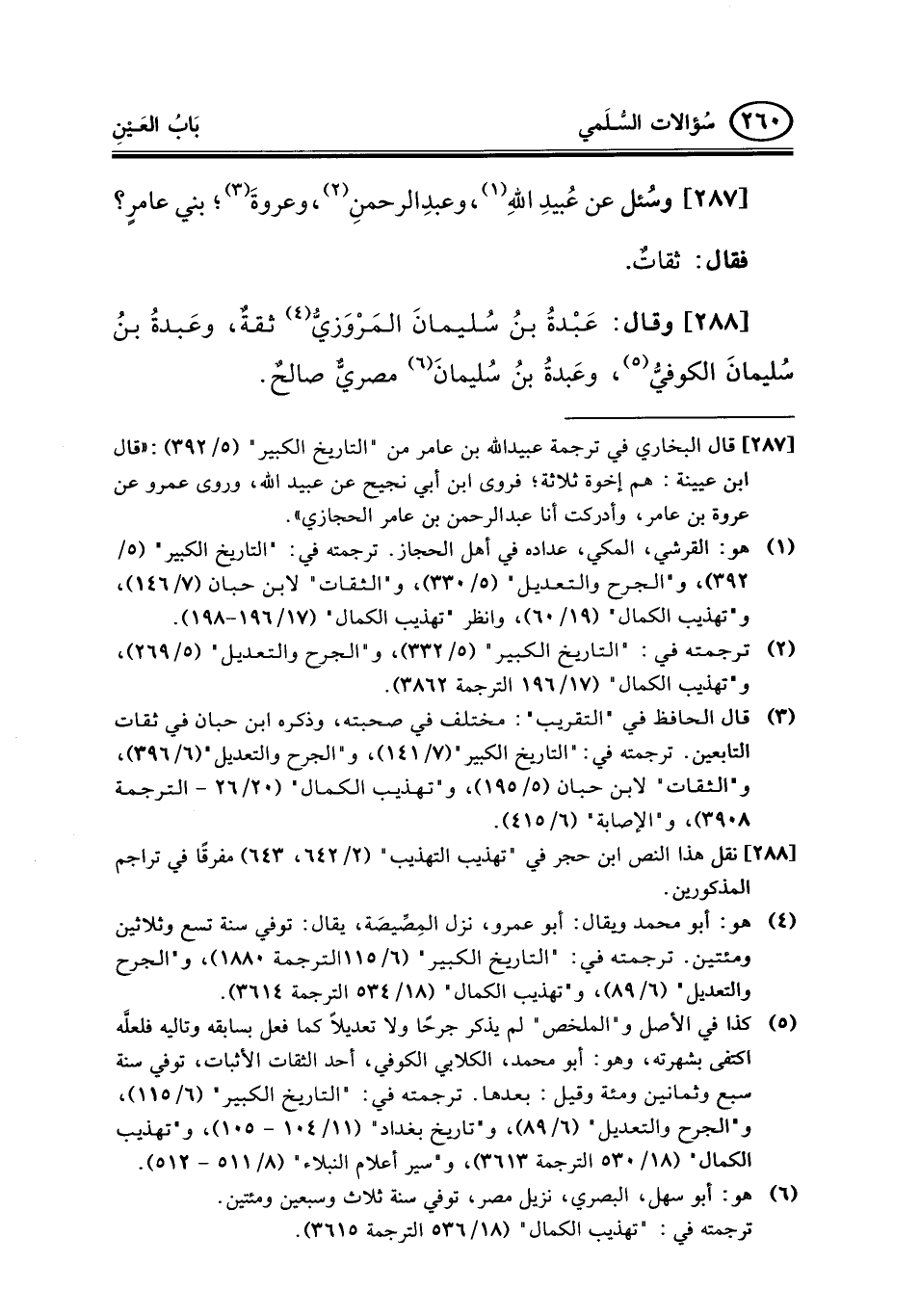 287 - وسُئل عن عُبيدِ اللهِ (¬1) ، وعبدِالرحمنِ (¬2) ، وعروةَ (¬3) ؛ بني عامرٍ؟