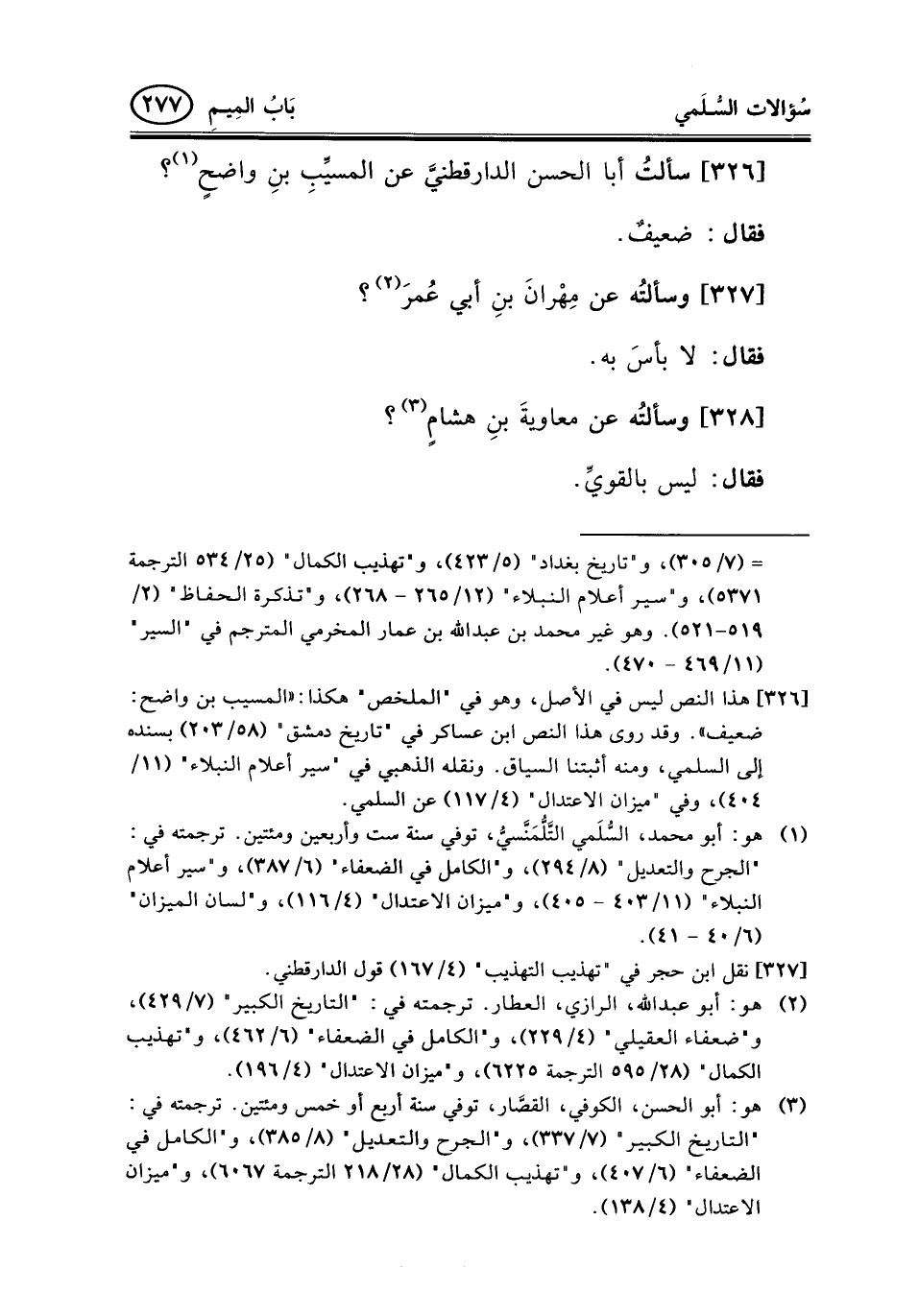 326 - سألتُ أبا الحسن الدارقطنيَّ عن المسيِّبِ بنِ واضحٍ (¬1) ؟