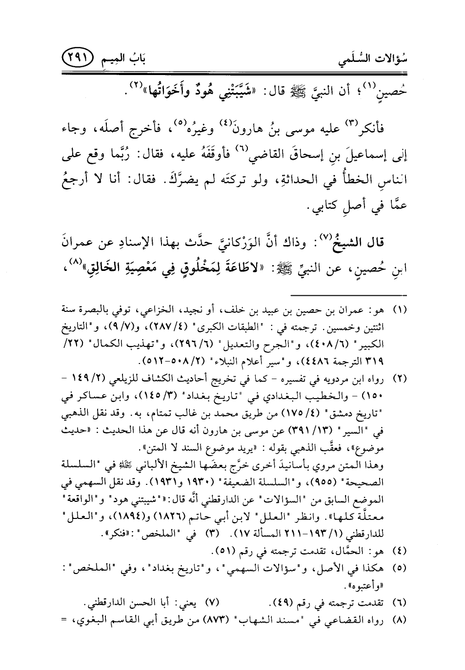 قال الشيخُ (¬7) : وذاك أنَّ الوَرْكانيَّ حدَّث بهذا الإسنادِ عن عمرانَ ابنِ حُصينٍ، عن النبيِّ صلى الله عليه وسلم: «لاطَاعَةَ لِمَخْلُوقٍ فِي مَعْصِيَةِ الخَالِقِ» (¬8) ،