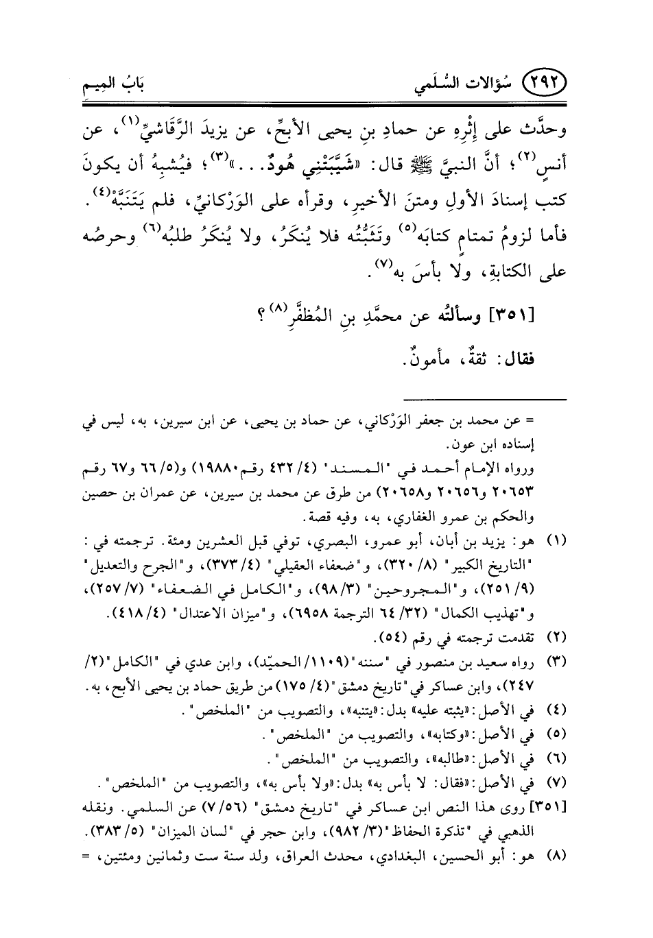 وحدَّث على إِثْرِهِ عن حمادِ بنِ يحيى الأبحِّ، عن يزيدَ الرَّقَاشيِّ (¬1) ، عن أنسٍ (¬2) ؛ أنَّ النبيَّ صلى الله عليه وسلم قال: «شَيَّبَتْنِي هُودٌ ... » (¬3) ؛ فيُشبِهُ أن يكونَ كتب إسنادَ الأولِ ومتنَ الأخيرِ، وقرأه على الوَرْكانيِّ، فلم يَتَنَبَّهْ (¬4) . فأما لزومُ تمتامٍ كتابَه (¬5) وتَثَبُّتُه فلا يُنكَرُ، ولا يُنكَرُ طلبُه (¬6) وحرصُه على الكتابةِ، ولا بأسَ به (¬7) .
