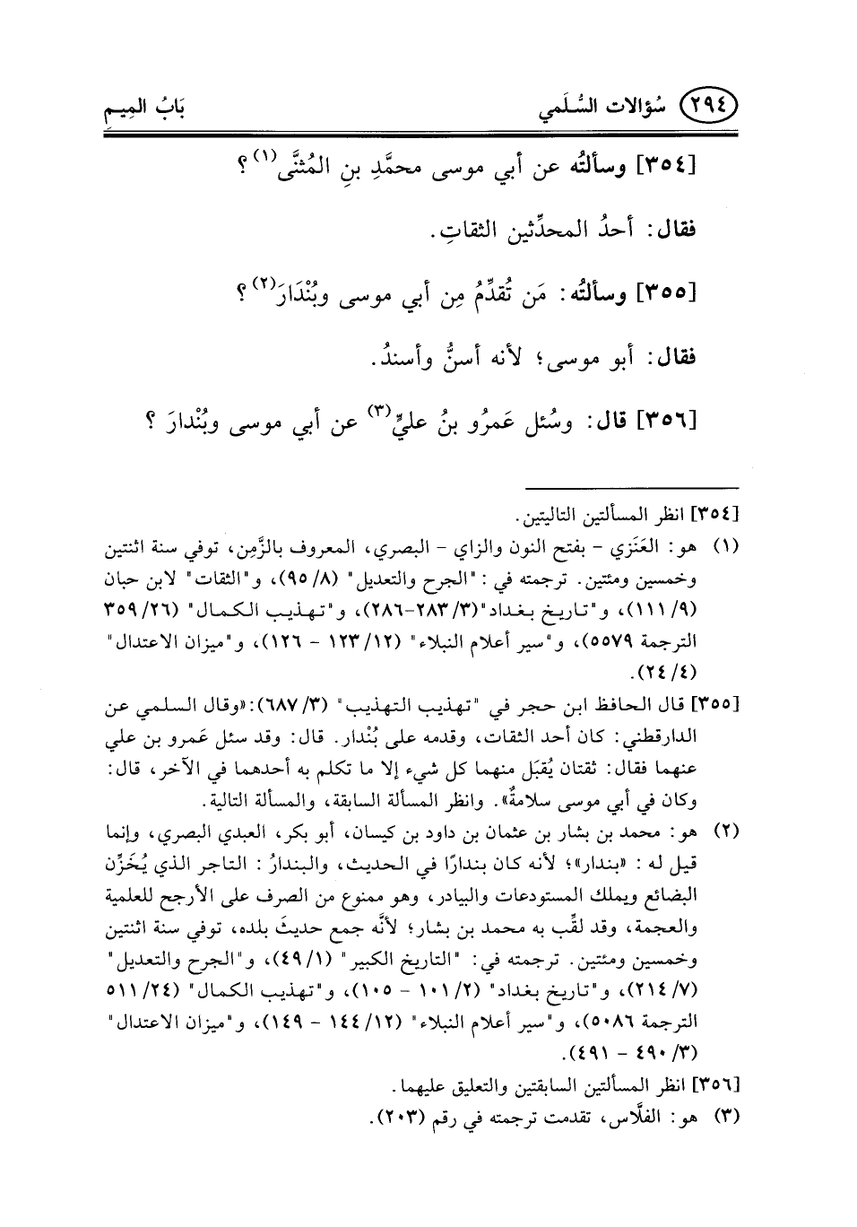 [355] قال الحافظ ابن حجر في "تهذيب التهذيب" (3/687) : «وقال السلمي عن الدارقطني: كان أحد الثقات، وقدمه على بُنْدار. قال: وقد سئل عَمرو بن علي عنهما فقال: ثقتان يُقبَل منهما كل شيء إلا ما تكلم به أحدهما في الآخر، قال: وكان في أبي موسى سلامةٌ» . وانظر المسألة السابقة، والمسألة التالية.
