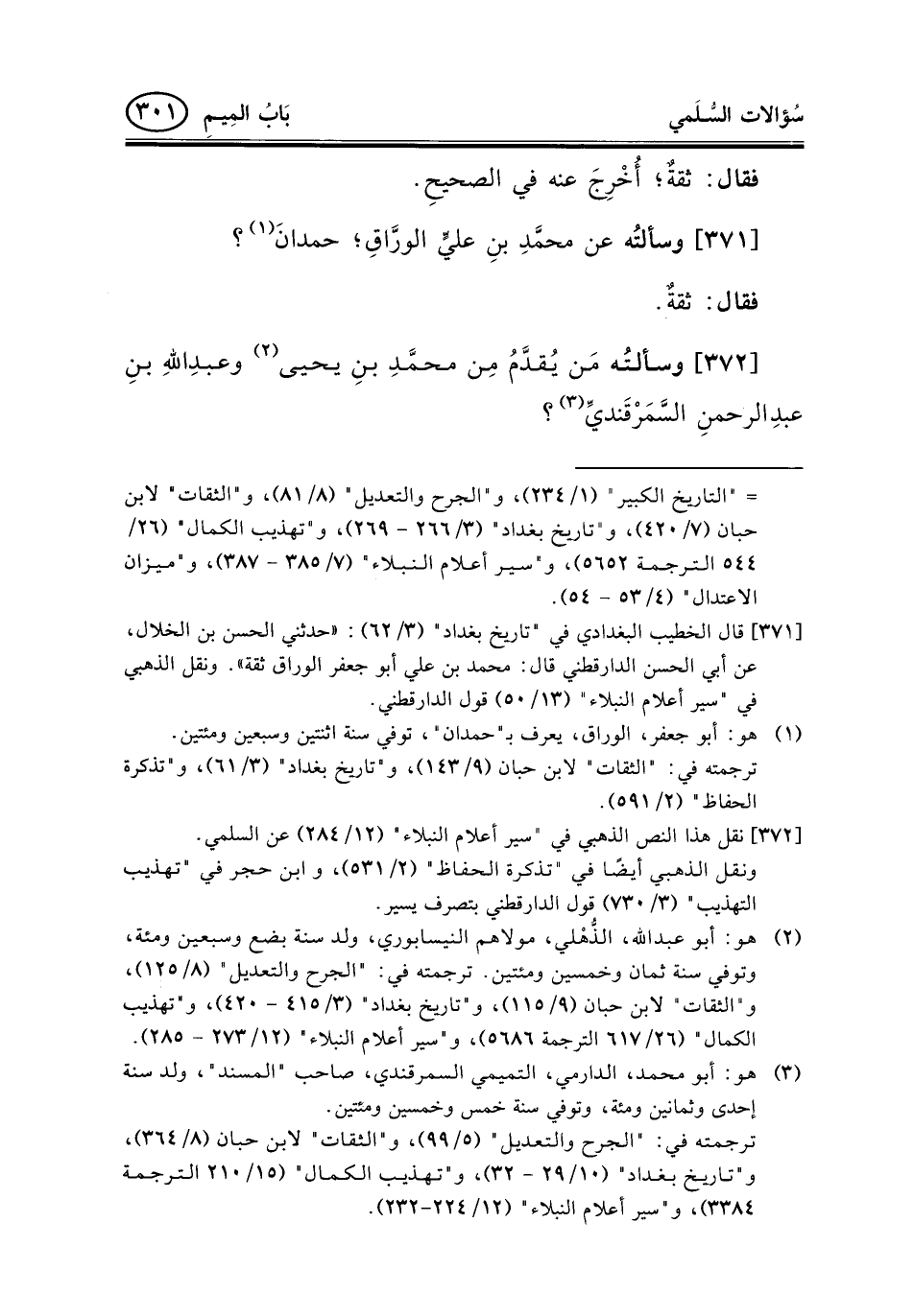 372 - وسألتُه مَن يُقدَّمُ مِن محمَّدِ بنِ يحيى (¬2) وعبدِاللهِ بنِ عبدِالرحمنِ السَّمَرْقَنديِّ (¬3) ؟
