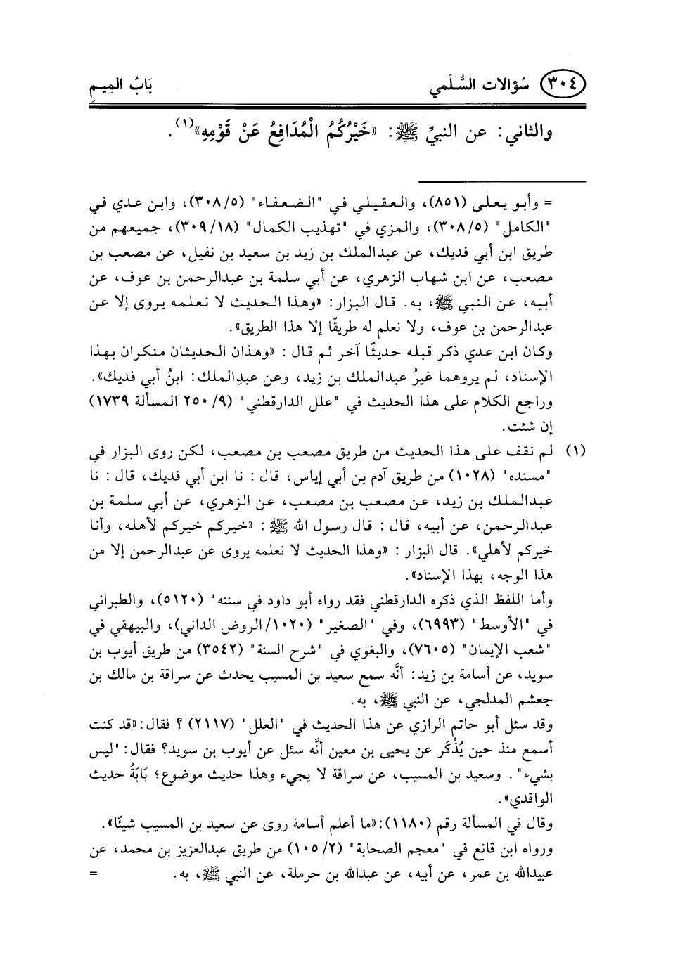 (¬1) لم نقف على هذا الحديث من طريق مصعب بن مصعب، لكن روى البزار في "مسنده" (1028) من طريق آدم بن أبي إياس، قال: نا ابن أبي فديك، قال: نا عبد الملك بن زيد، عن مصعب بن مصعب، عن الزهري، عن أبي سلمة بن عبد الرحمن، عن أبيه، قال: قال رسول الله صلى الله عليه وسلم: «خيركم خيركم لأهله، وأنا خيركم لأهلي» . قال البزار: «وهذا الحديث لا نعلمه يروى عن عبد الرحمن إلا من هذا الوجه، بهذا الإسناد» .