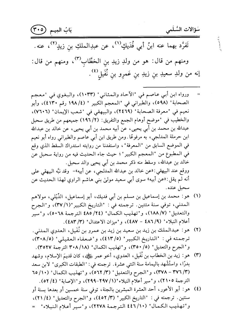 ومنهم من قال: هو من ولدِ زيدِ بنِ الخطَّابِ (¬3) ، ومنهم من قال: إنه من ولدِ سعيدِ بنِ زيدِ بنِ عَمرِو بنِ نُفَيلٍ (¬4) .