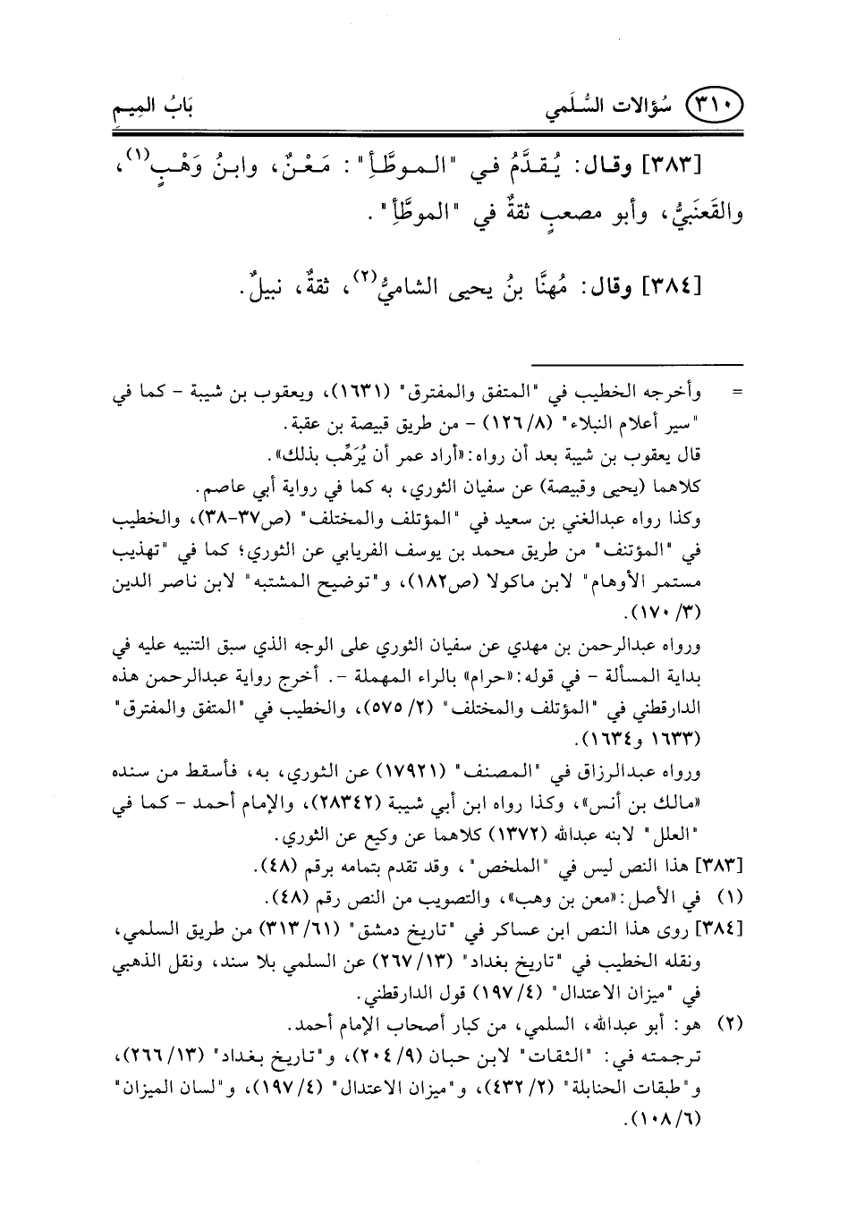 384 - وقال: مُهنَّا بنُ يحيى الشاميُّ (¬2) ، ثقةٌ، نبيلٌ.
