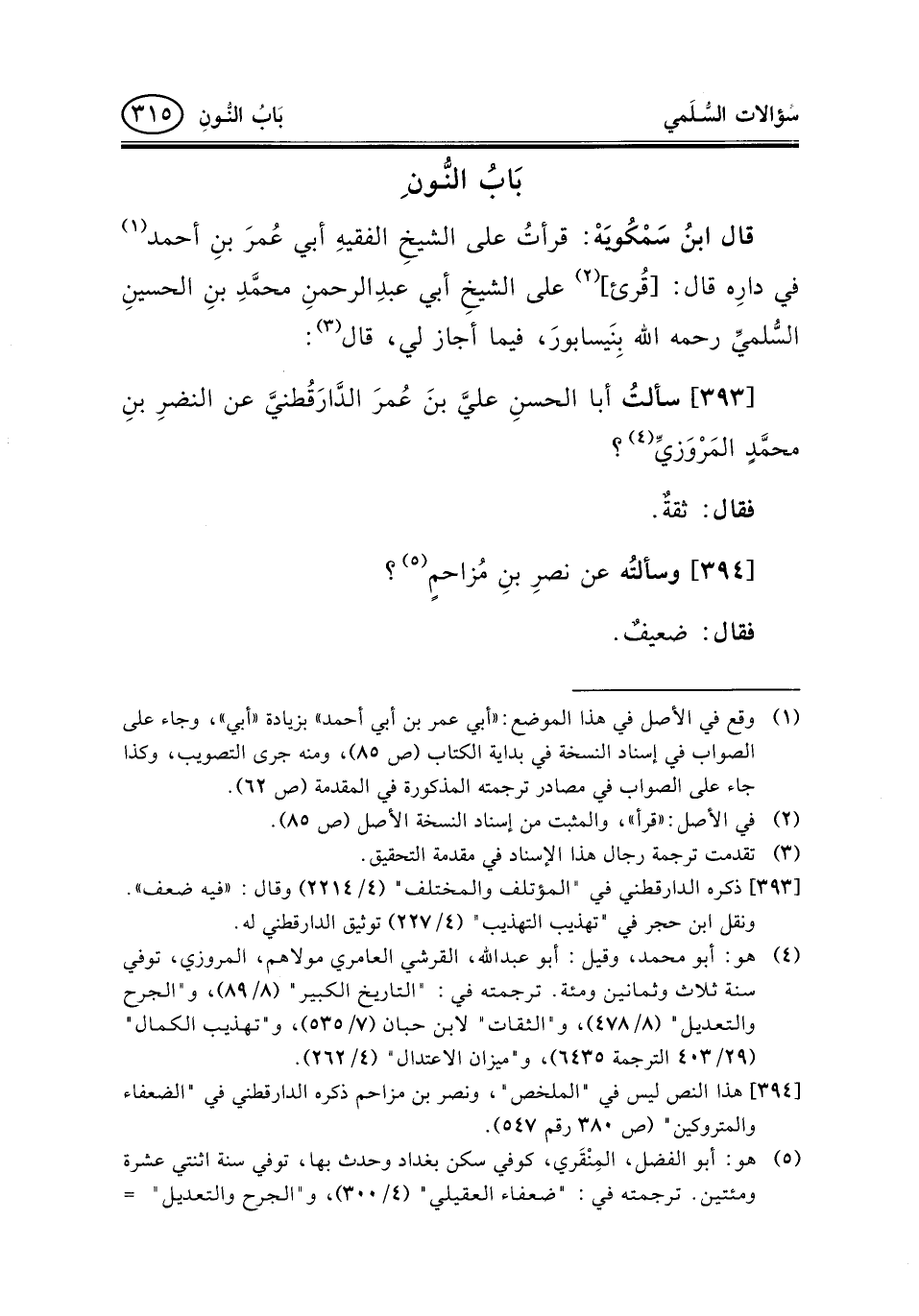 393 - سألتُ أبا الحسنِ عليَّ بنَ عُمرَ الدَّارَقُطنيَّ عن النضرِ بنِ محمَّدٍ المَرْوَزيِّ (¬4) ؟