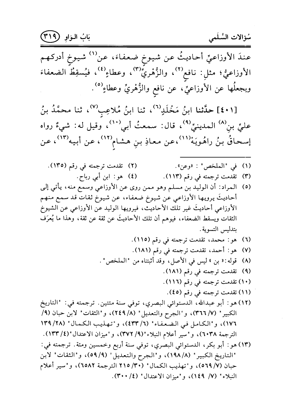 (¬5) المراد: أن الوليد بن مسلم وهو ممن روى عن الأوزاعي وسمع منه، يأتي إلى أحاديثَ يرويها الأوزاعي عن شيوخ ضعفاء، عن شيوخ ثقات قد سمع منهم الأوزاعي أحاديثَ غير تلك الأحاديث، فيرويها الوليد عن الأوزاعي عن الشيوخ الثقات ويسقط الضعفاء، فيوهم أن تلك الأحاديثَ عن ثقة عن ثقة، وهذا ما يُعرَف بتدليس التسوية.